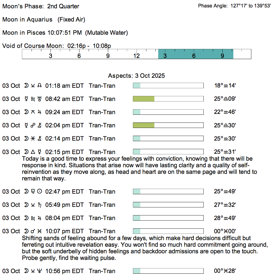 - A void Moon period occurs from 2:14 PM to 10:06 PM today.