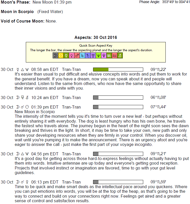 The following aspects (major only) and positions are at noon (EDT) on October 30th: