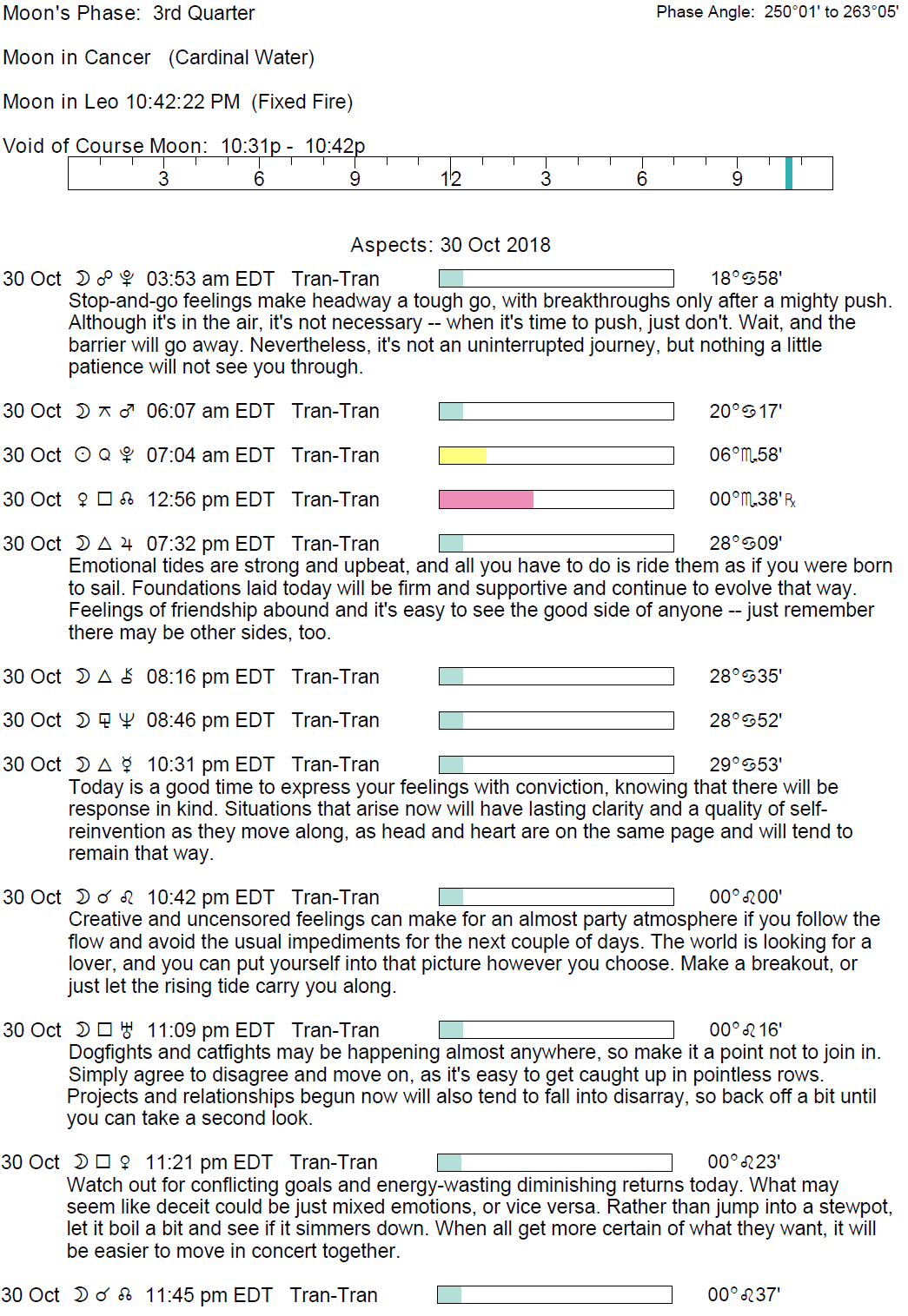 Planet Color Key: The longer the bar, the slower the aspecting planet and the longer the duration of the planet’s transit.