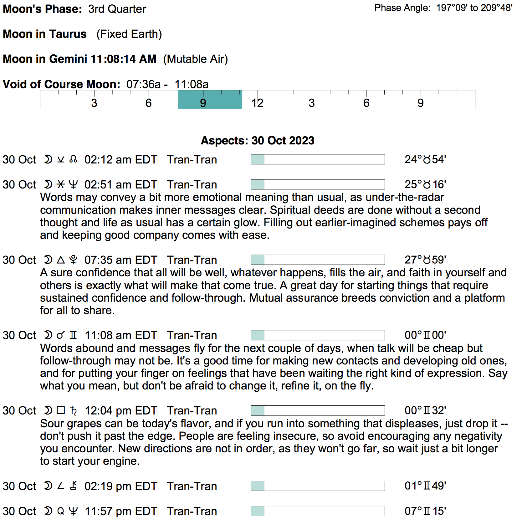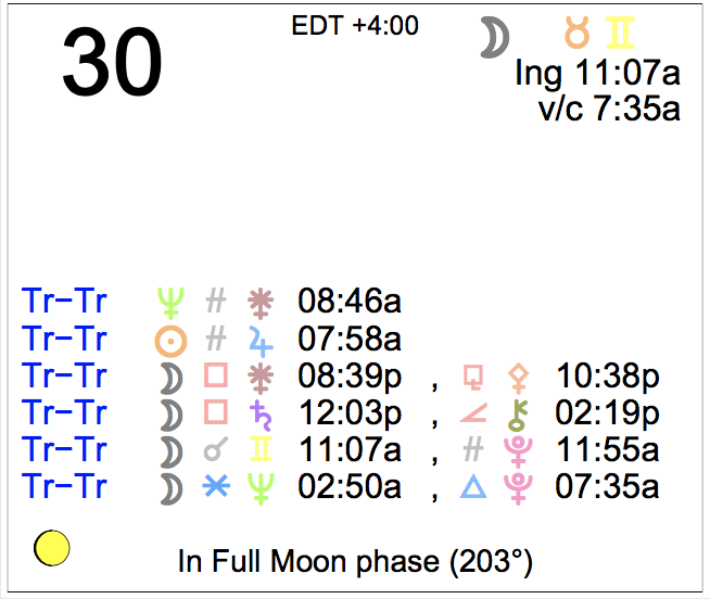 Planet Color Key: The longer the bar, the slower the aspecting planet, and the longer the duration of the planet’s transit.