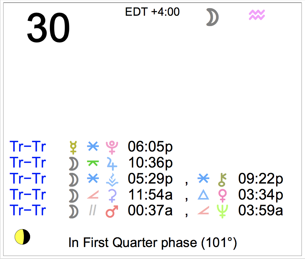 Planet Color Key: The longer the bar, the slower the aspecting planet, and the longer the duration of the planet’s transit.