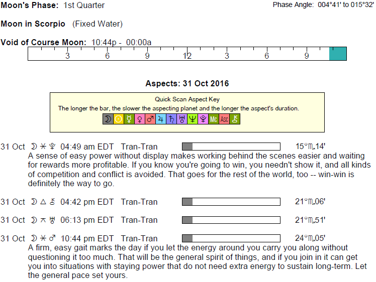 The following aspects (major only) and positions are at noon (EDT) on October 31st: