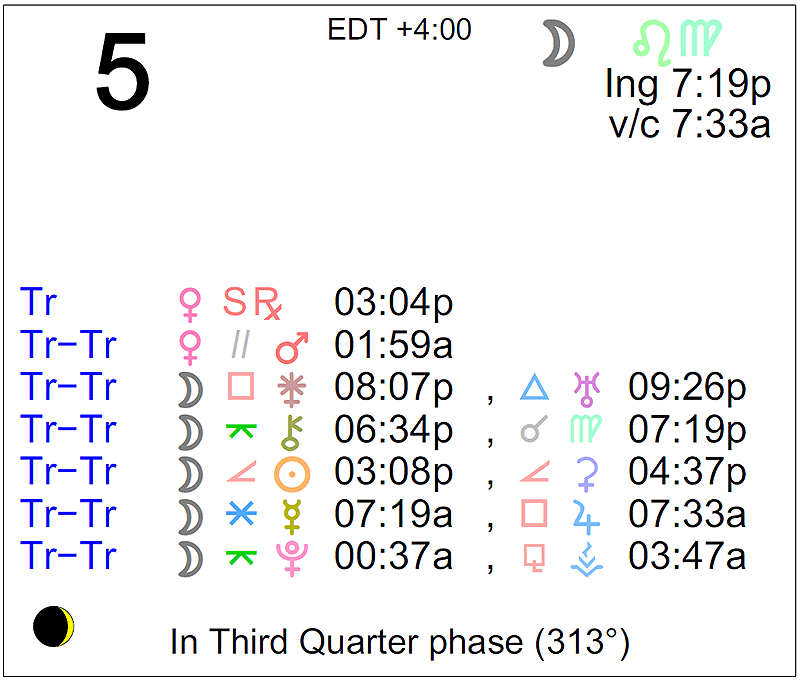 - The Moon is waning and in its Last Quarter phase until 3:08 PM, after which the Moon is in its Waning Crescent phase.