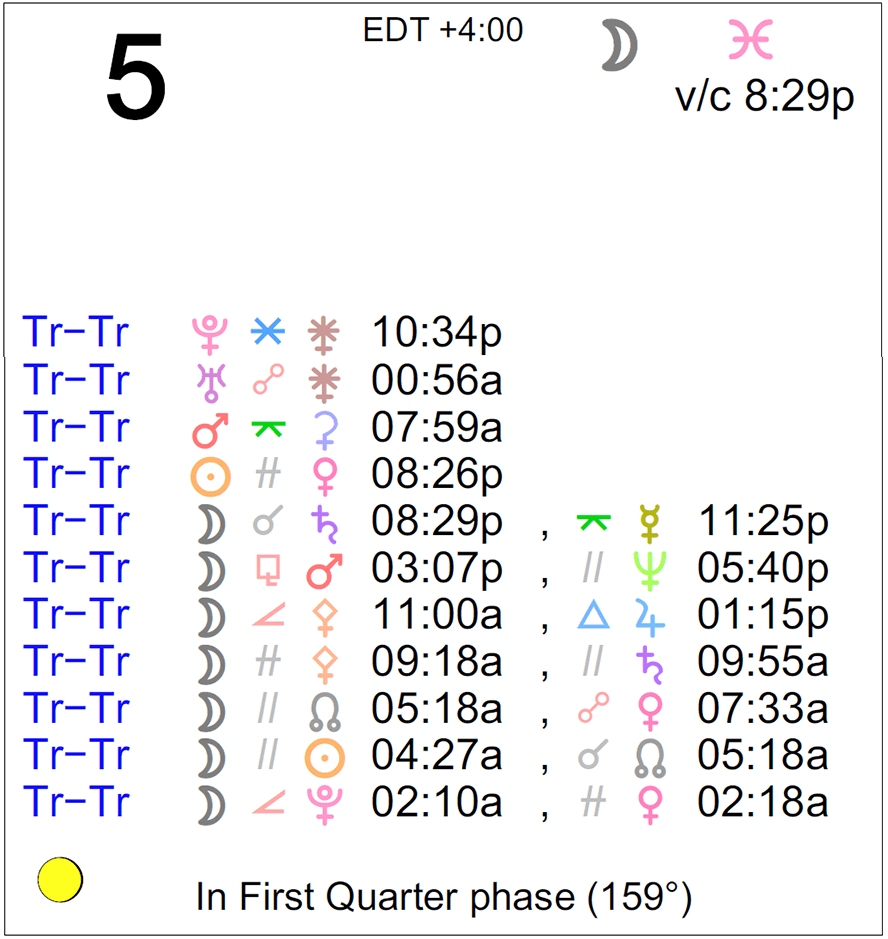 Planet Color Key: The longer the bar, the slower the aspecting planet, and the longer the duration of the planet’s transit.