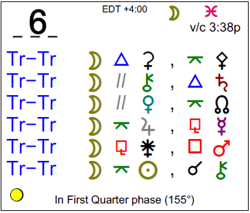 The following aspects (major only) and positions are at noon (EDT) on October 6th: