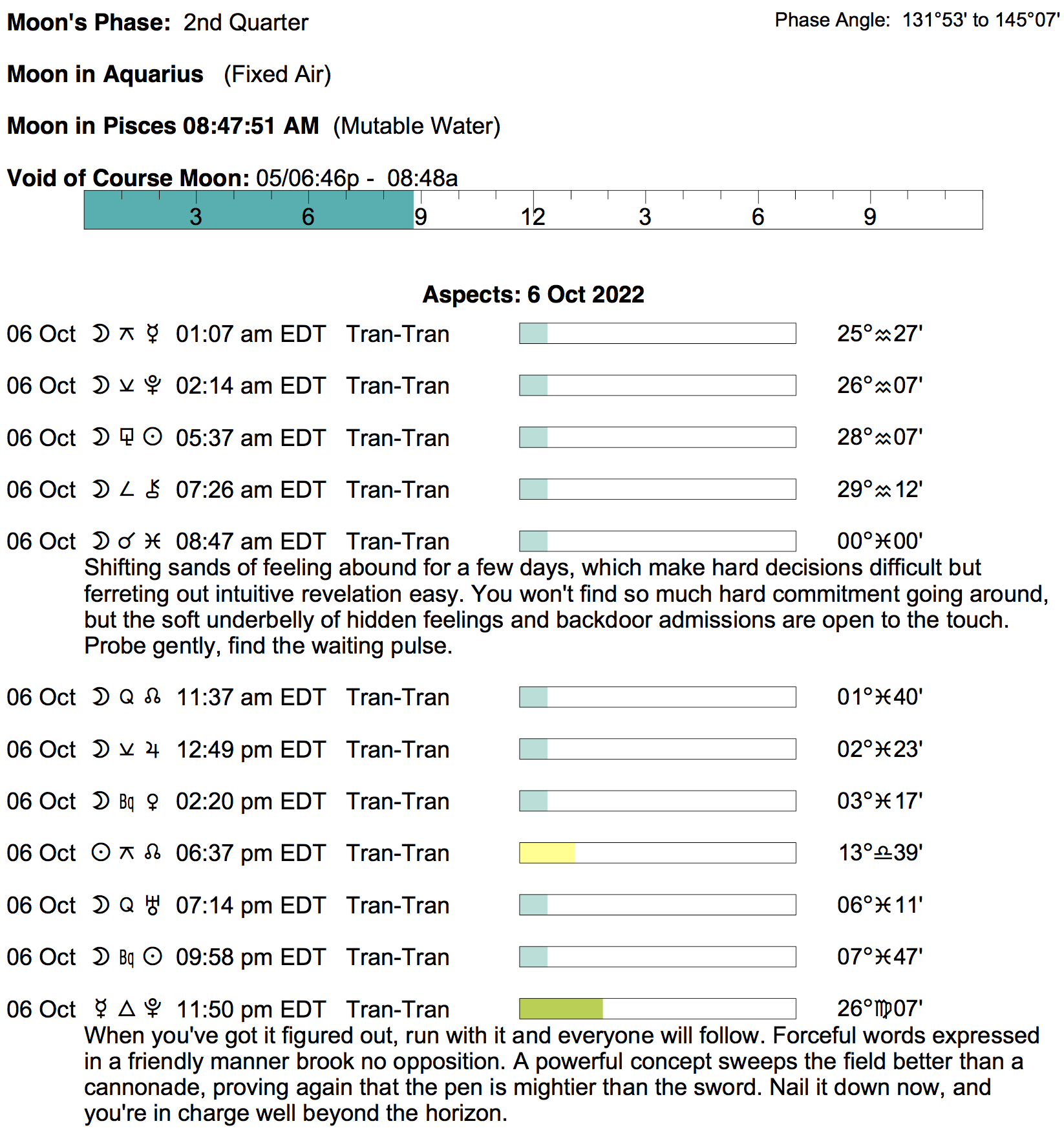 Planet Color Key: The longer the bar, the slower the aspecting planet, and the longer the duration of the planet’s transit.
