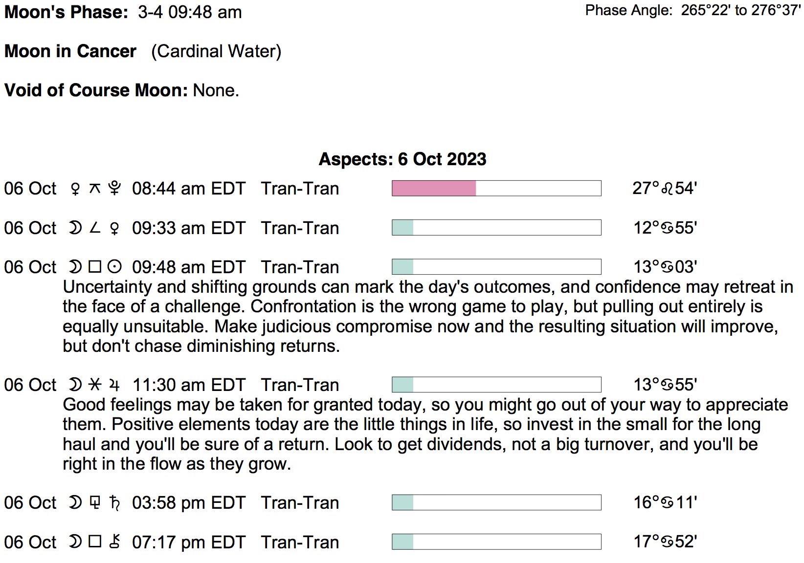 Planet Color Key: The longer the bar, the slower the aspecting planet, and the longer the duration of the planet’s transit.