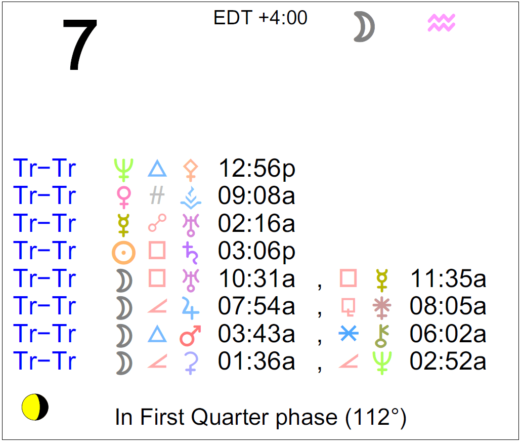 Planet Color Key: The longer the bar, the slower the aspecting planet and the longer the duration of the planet’s transit.