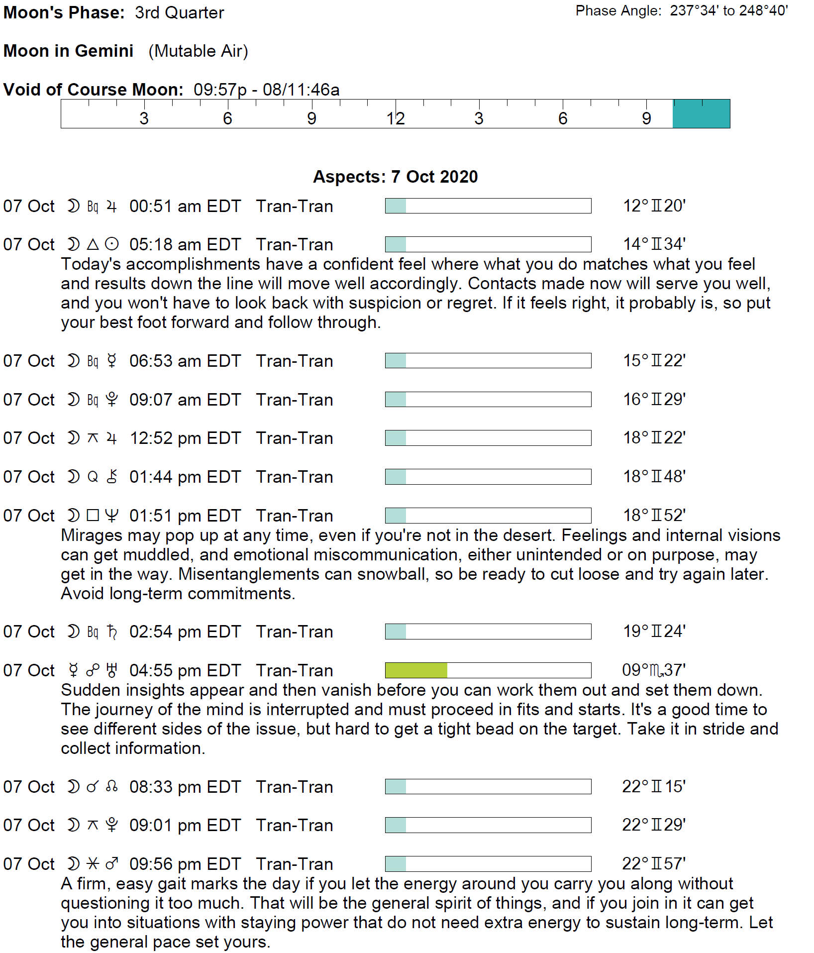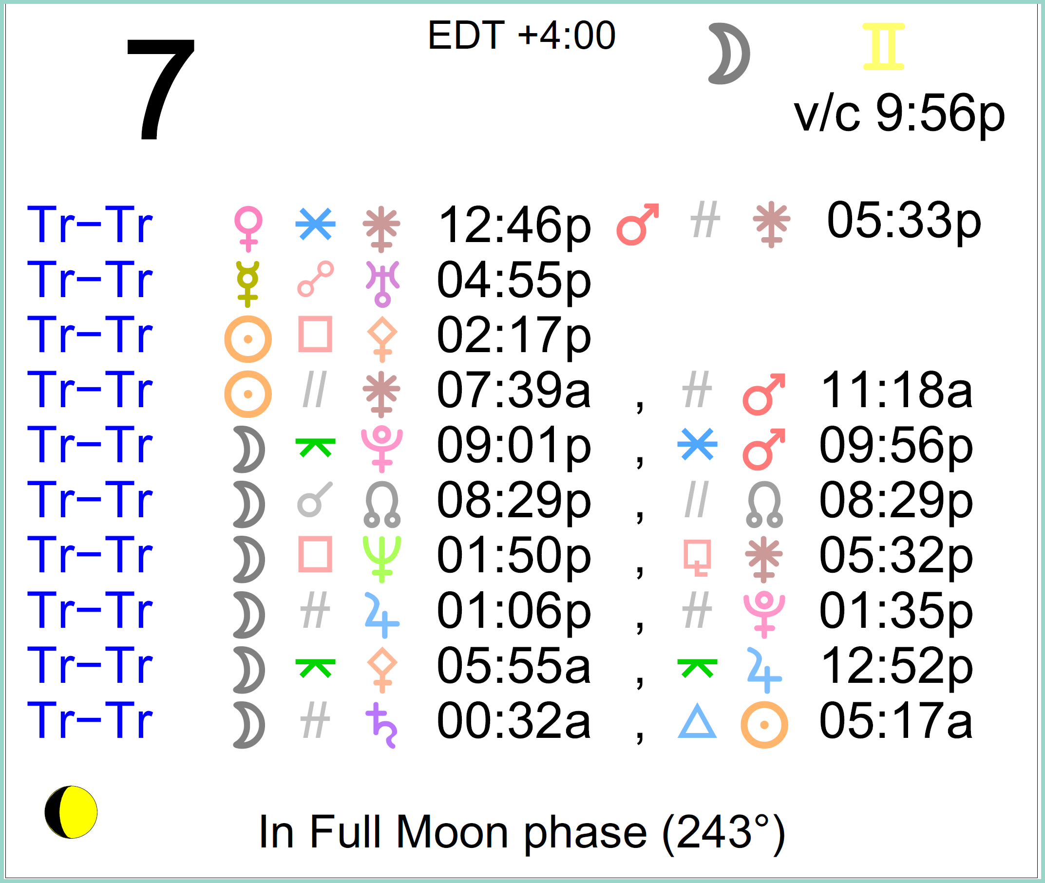 Planet Color Key: The longer the bar, the slower the aspecting planet and the longer the duration of the planet’s transit.