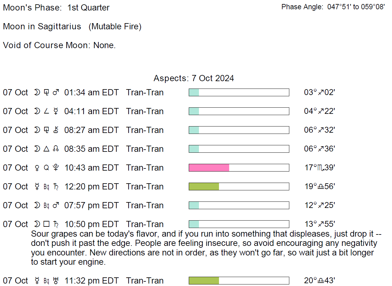 Planet Color Key: The longer the bar, the slower the aspecting planet, and the longer the duration of the planet’s transit.