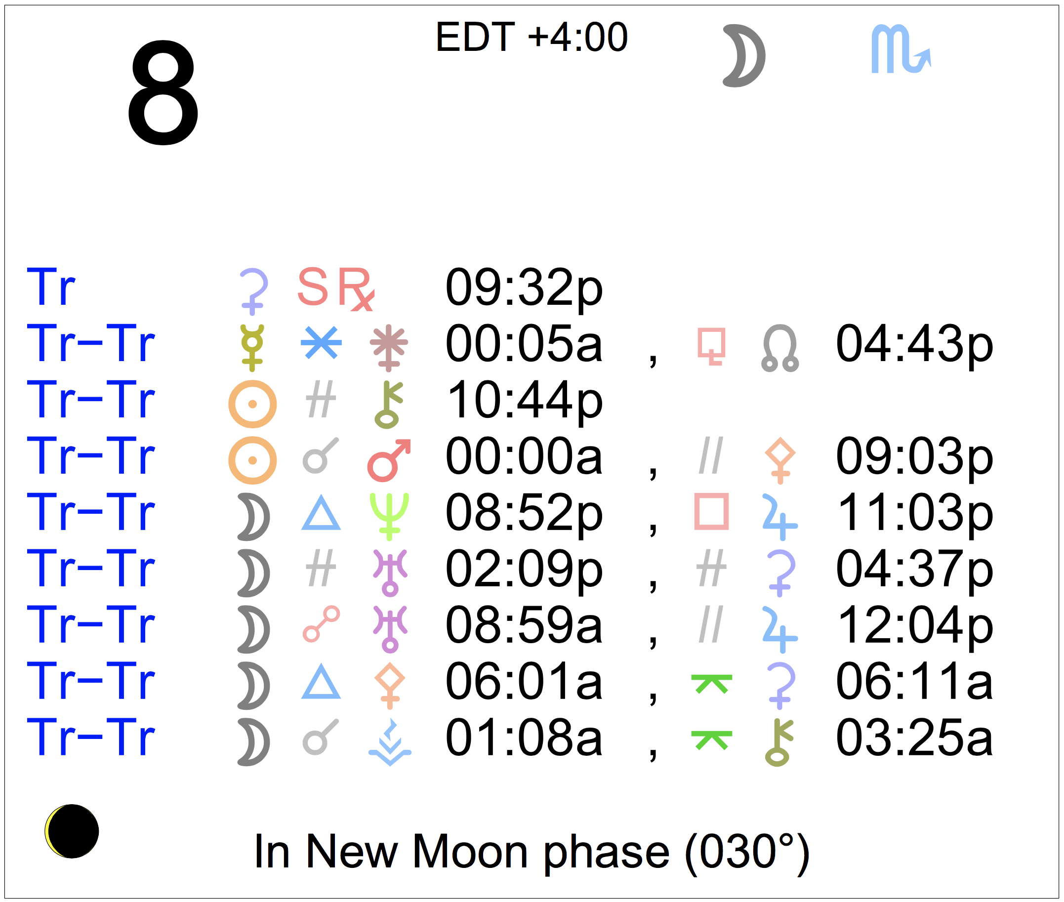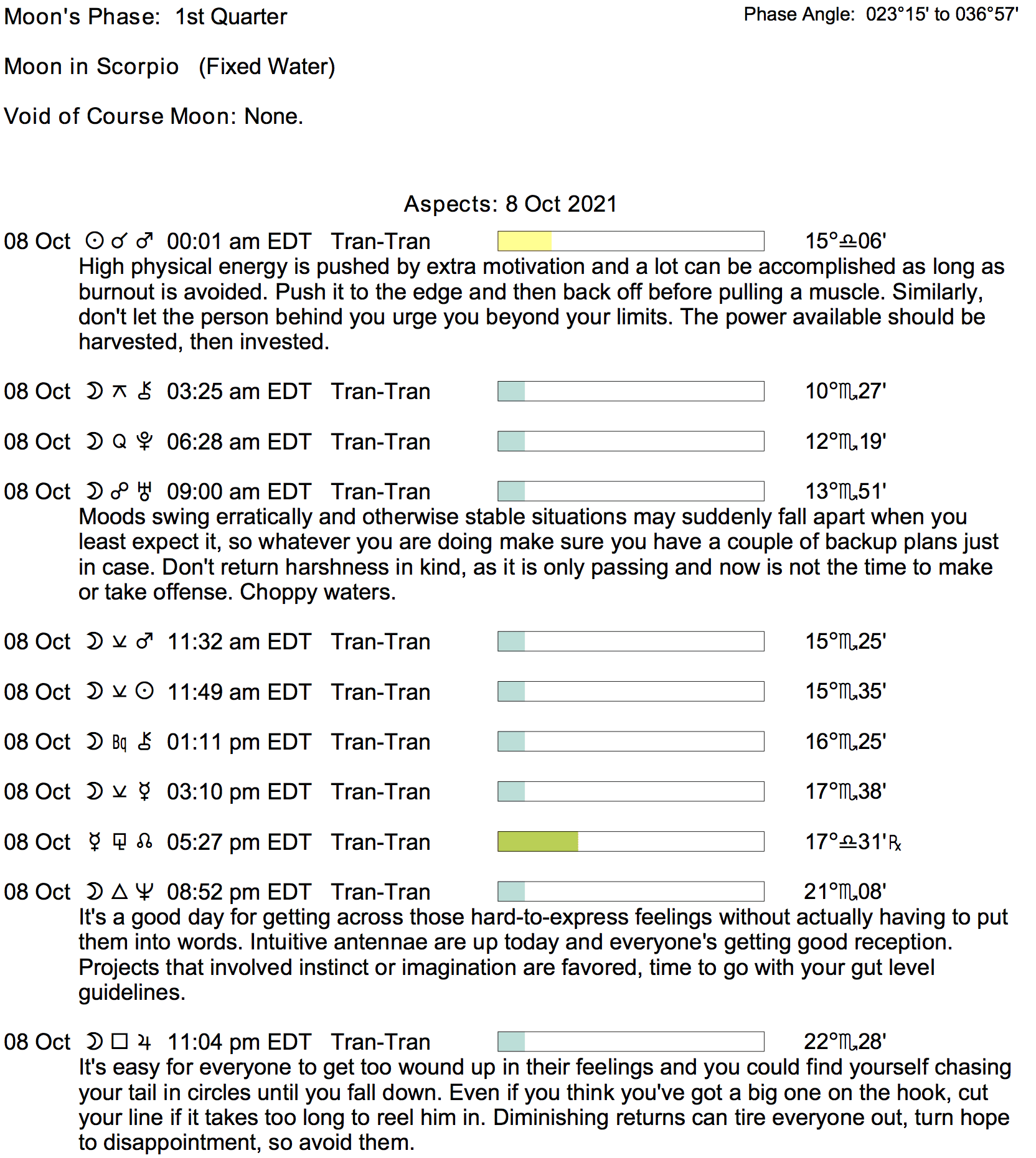 Planet Color Key: The longer the bar, the slower the aspecting planet, and the longer the duration of the planet’s transit.