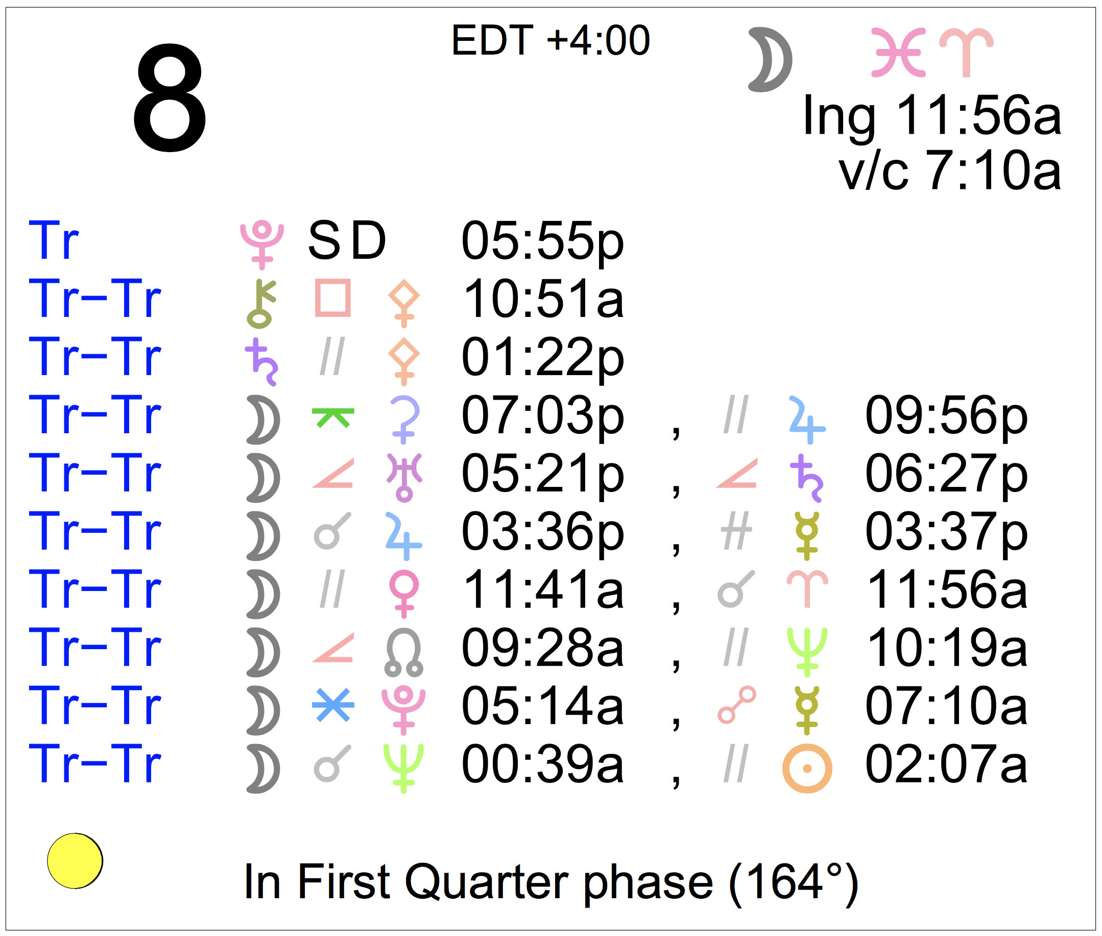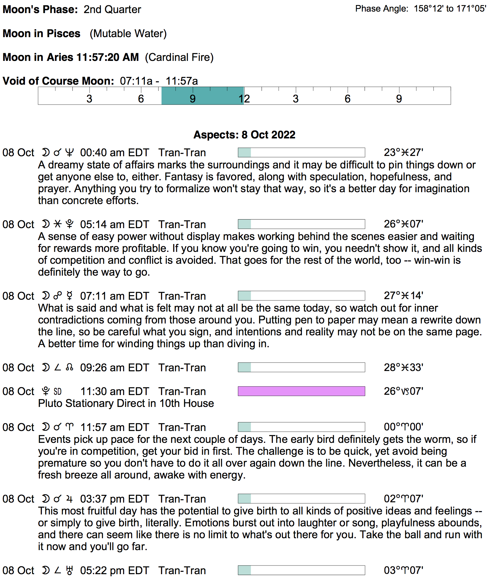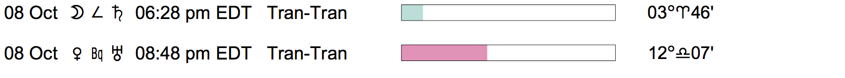 Planet Color Key: The longer the bar, the slower the aspecting planet, and the longer the duration of the planet’s transit.