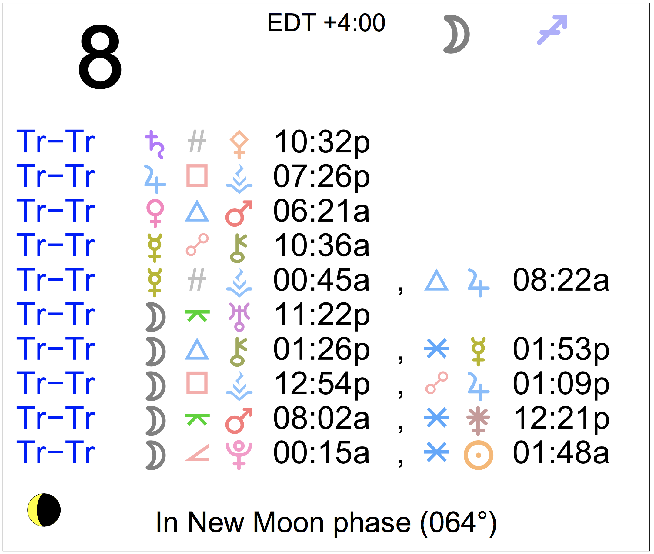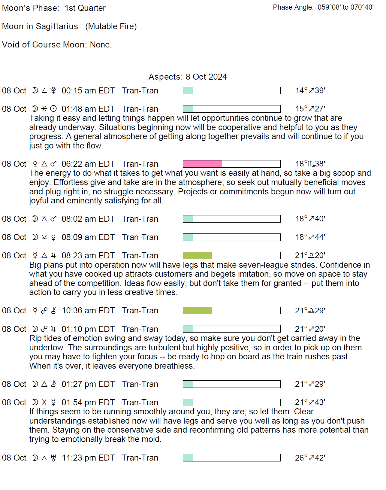 Planet Color Key: The longer the bar, the slower the aspecting planet, and the longer the duration of the planet’s transit.
