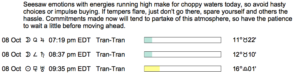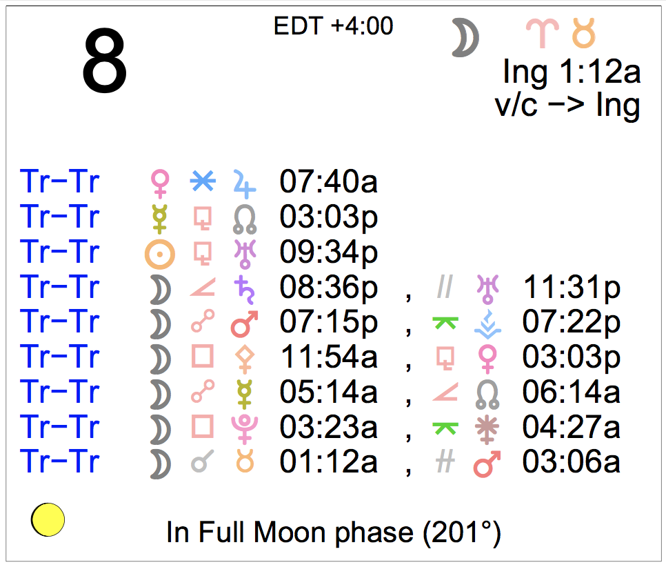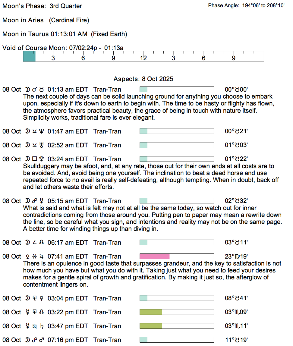 Planet Color Key: The longer the bar, the slower the aspecting planet, and the longer the duration of the planet’s transit.