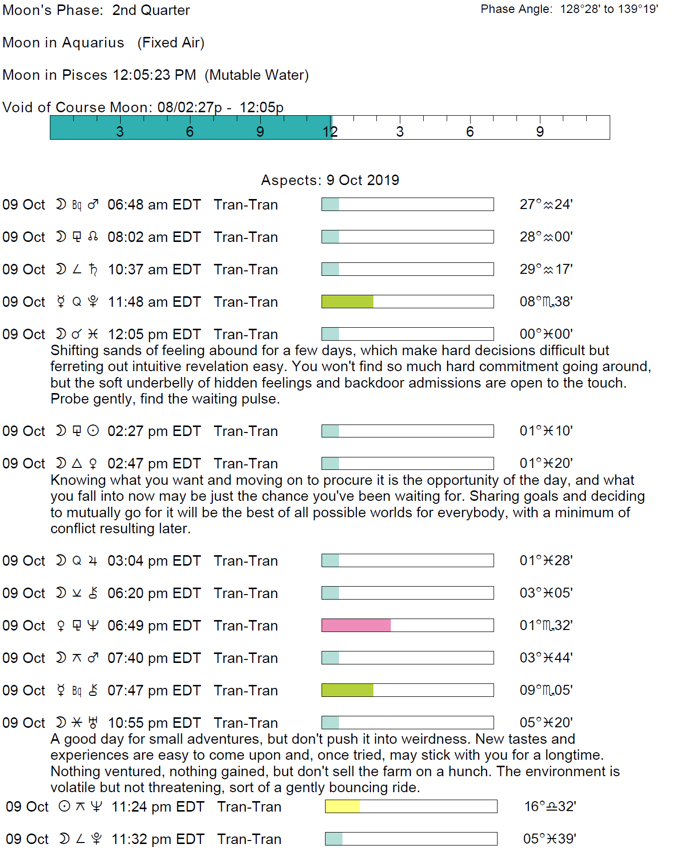 Planet Color Key: The longer the bar, the slower the aspecting planet and the longer the duration of the planet’s transit.