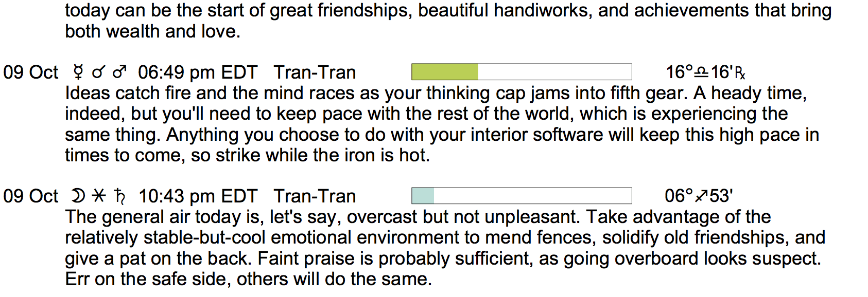 Planet Color Key: The longer the bar, the slower the aspecting planet, and the longer the duration of the planet’s transit.