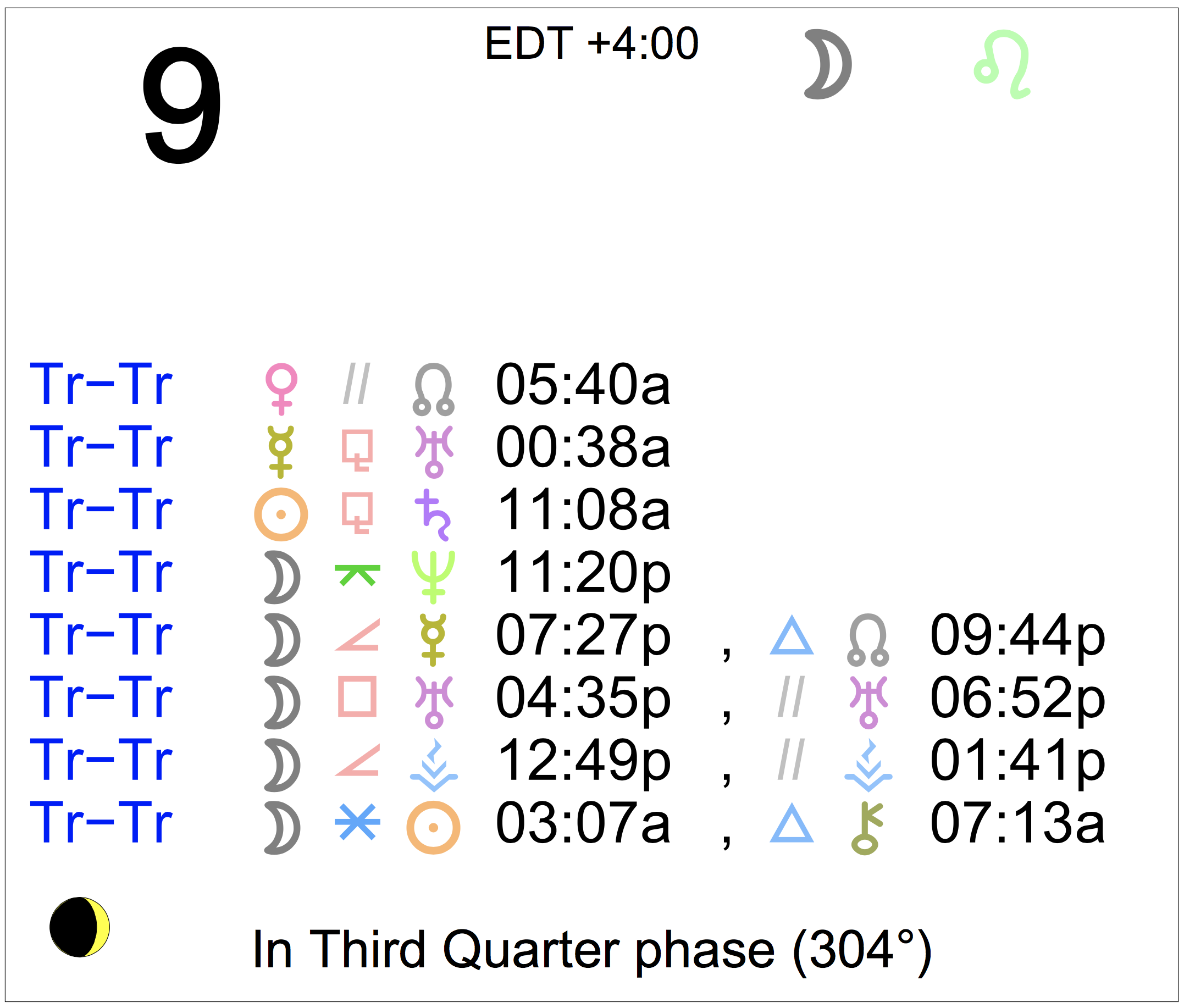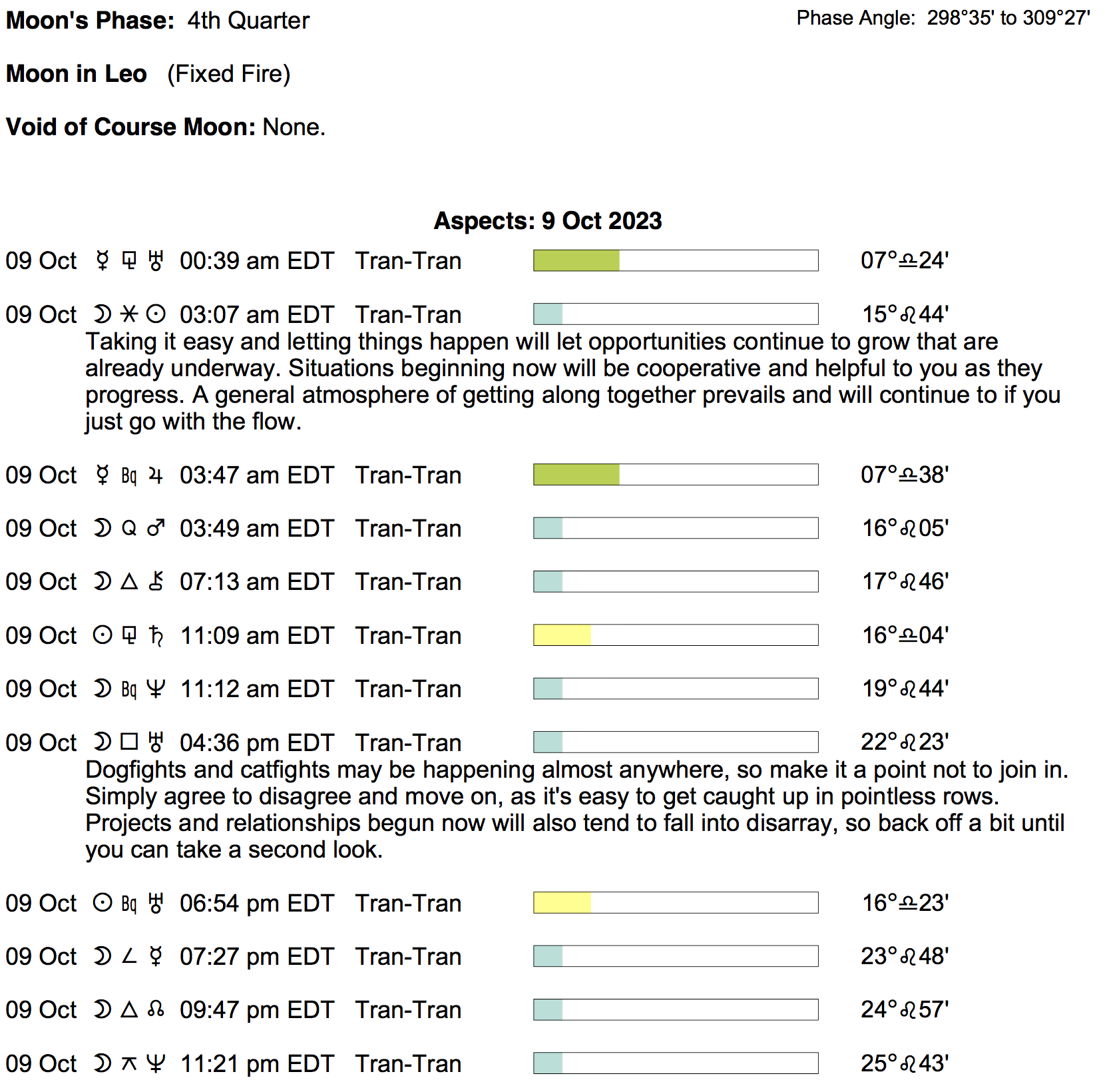 Planet Color Key: The longer the bar, the slower the aspecting planet, and the longer the duration of the planet’s transit.