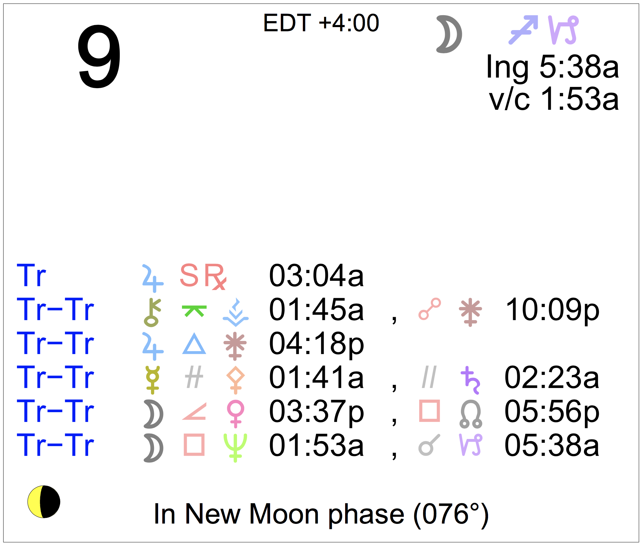 Planet Color Key: The longer the bar, the slower the aspecting planet, and the longer the duration of the planet’s transit.