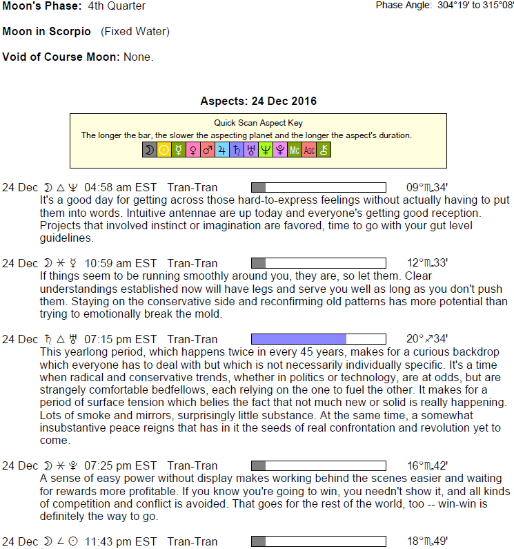 The following aspects (major only) and positions are at noon (EST) on December 24th:
