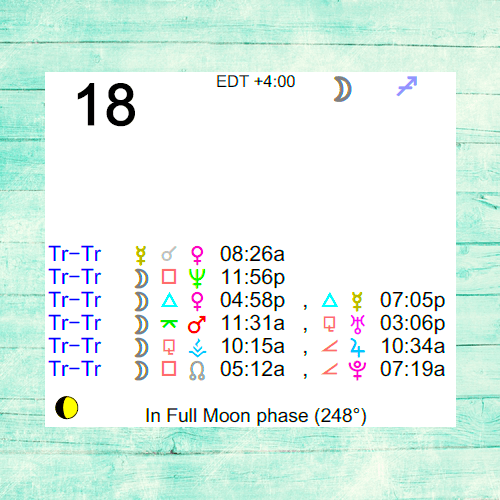 The following aspects (major only) and positions are at noon (EDT) on March 18th: