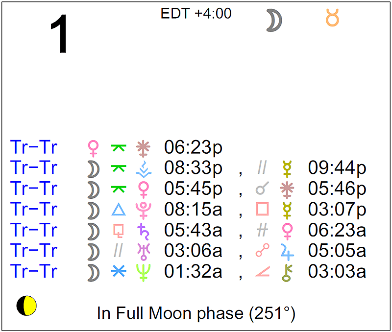 Planet Color Key: The longer the bar, the slower the aspecting planet and the longer the duration of the planet’s transit.