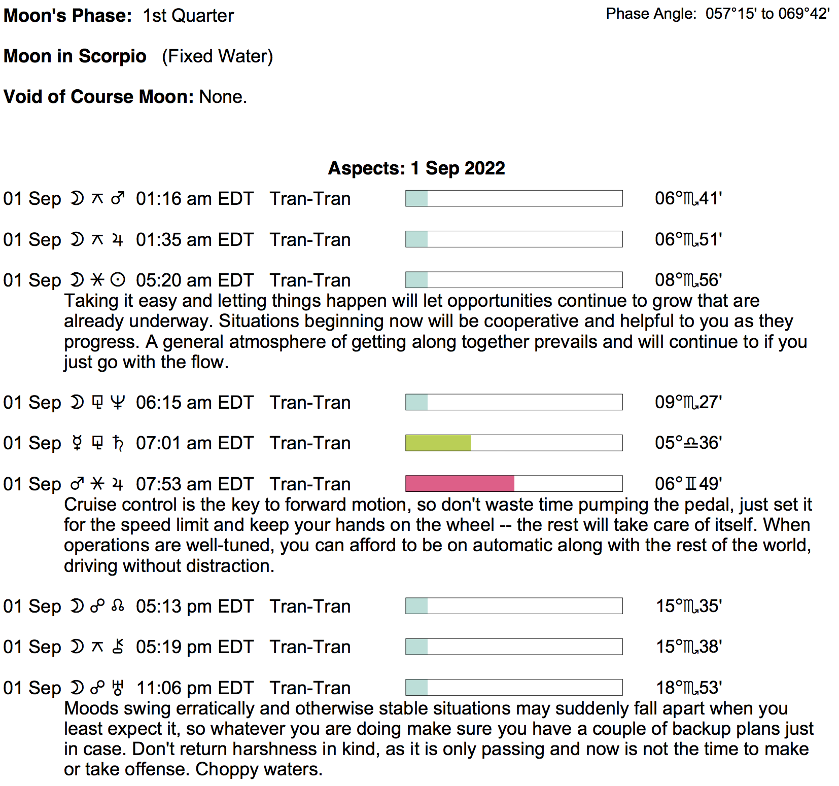 Planet Color Key: The longer the bar, the slower the aspecting planet, and the longer the duration of the planet’s transit.
