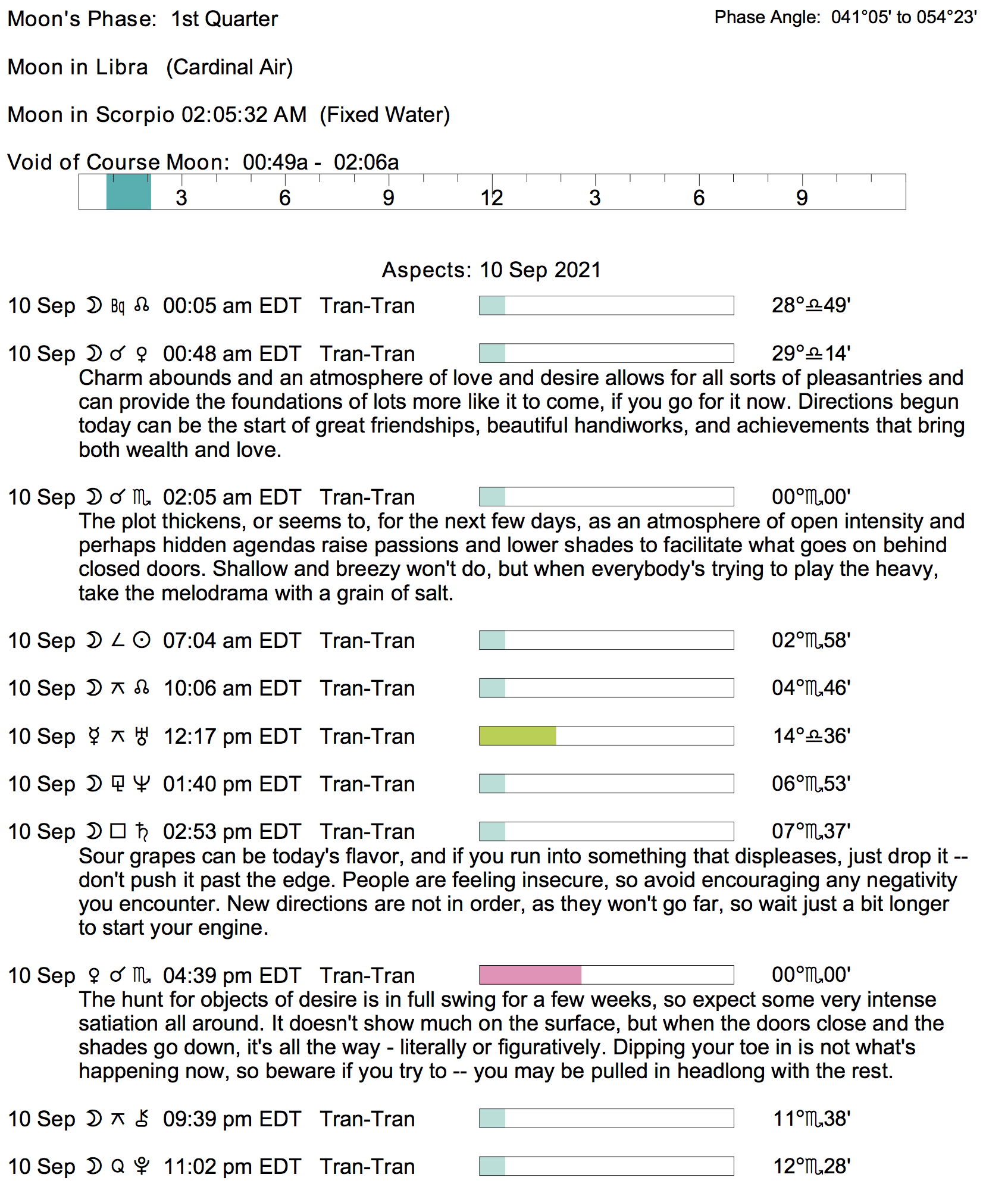 Planet Color Key: The longer the bar, the slower the aspecting planet, and the longer the duration of the planet’s transit.
