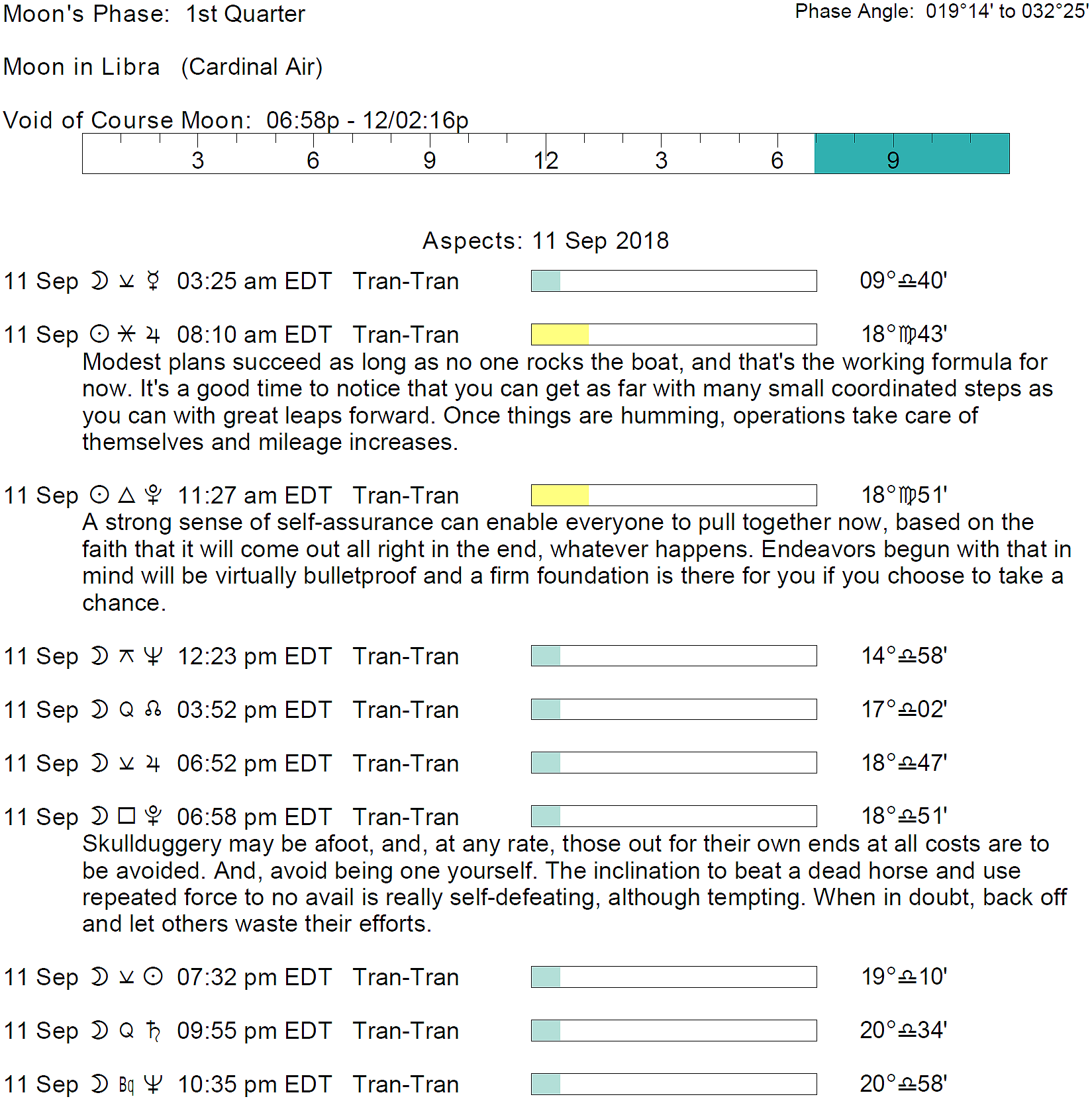 Planet Color Key: The longer the bar, the slower the aspecting planet and the longer the duration of the planet’s transit.