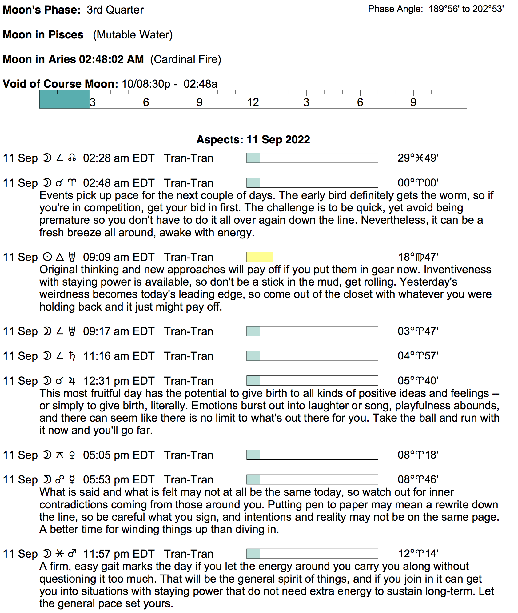 Planet Color Key: The longer the bar, the slower the aspecting planet, and the longer the duration of the planet’s transit.