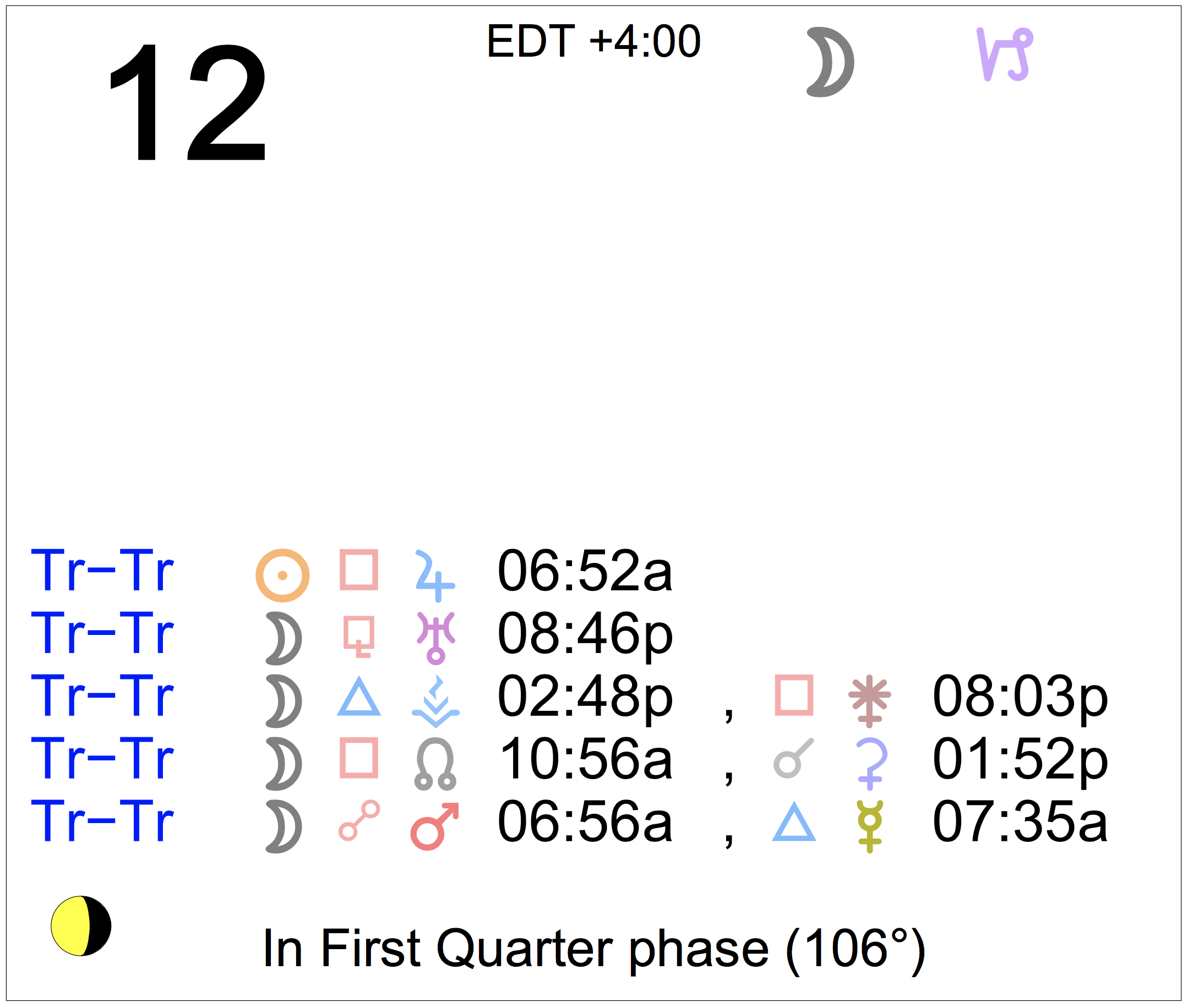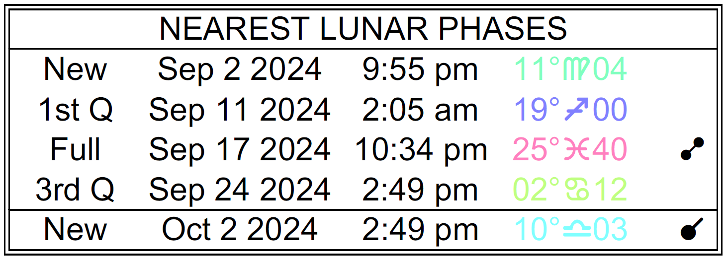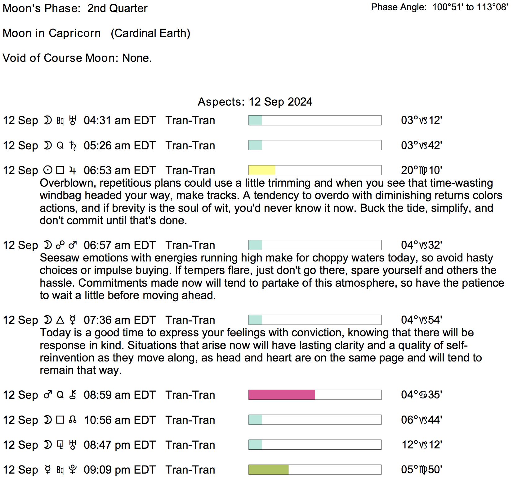 Planet Color Key: The longer the bar, the slower the aspecting planet, and the longer the duration of the planet’s transit.
