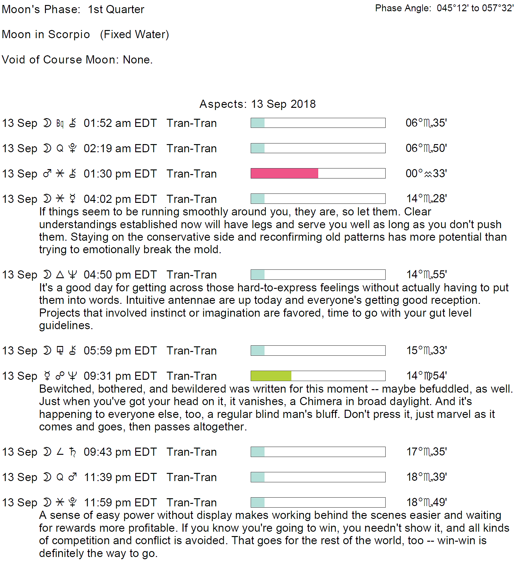 Planet Color Key: The longer the bar, the slower the aspecting planet and the longer the duration of the planet’s transit.