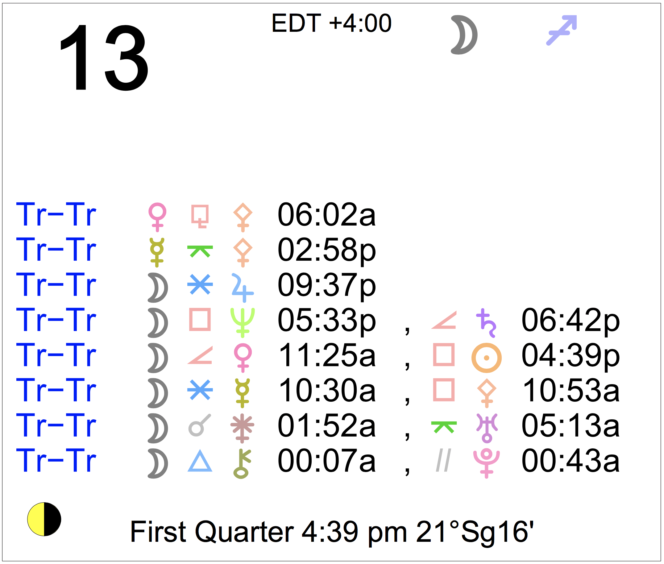 Planet Color Key: The longer the bar, the slower the aspecting planet, and the longer the duration of the planet’s transit.