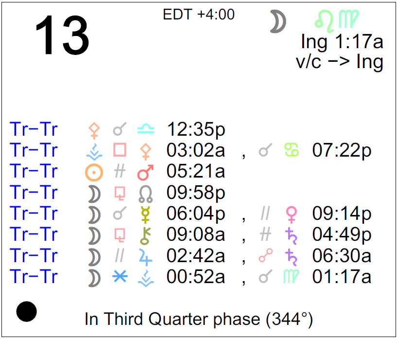 Planet Color Key: The longer the bar, the slower the aspecting planet, and the longer the duration of the planet’s transit.