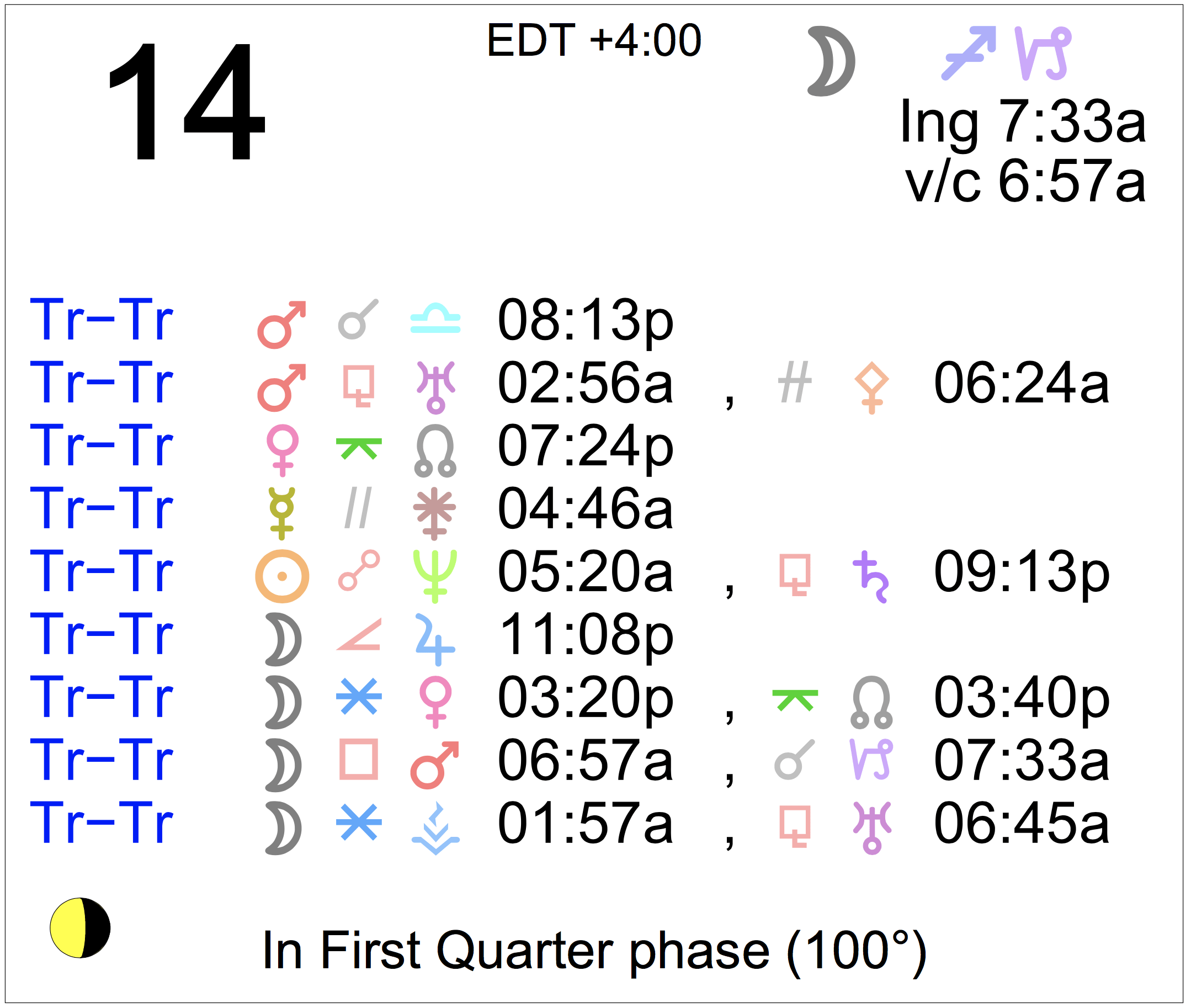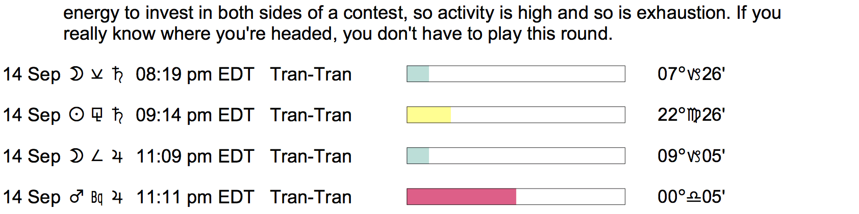 Planet Color Key: The longer the bar, the slower the aspecting planet, and the longer the duration of the planet’s transit.