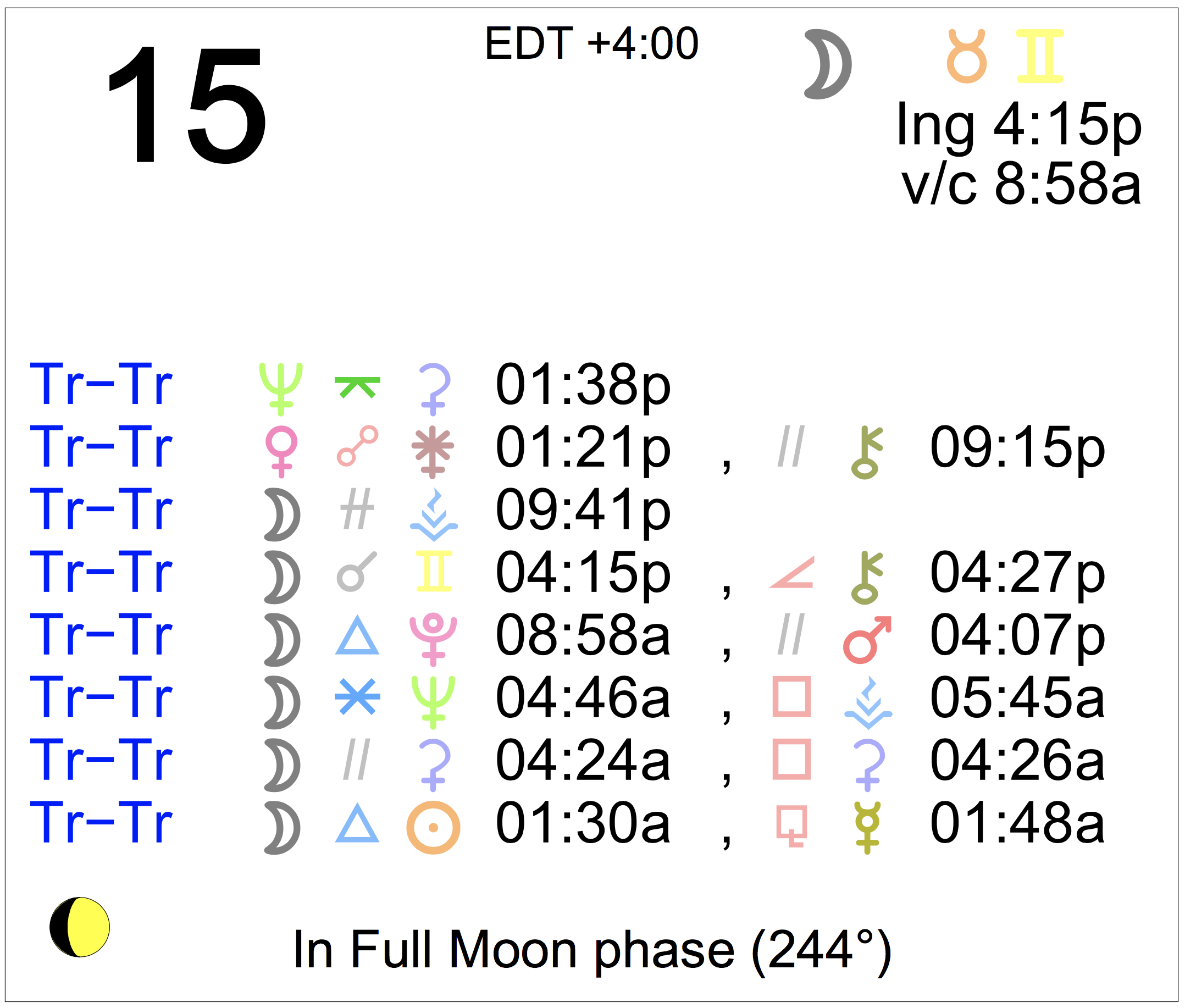 Planet Color Key: The longer the bar, the slower the aspecting planet, and the longer the duration of the planet’s transit.