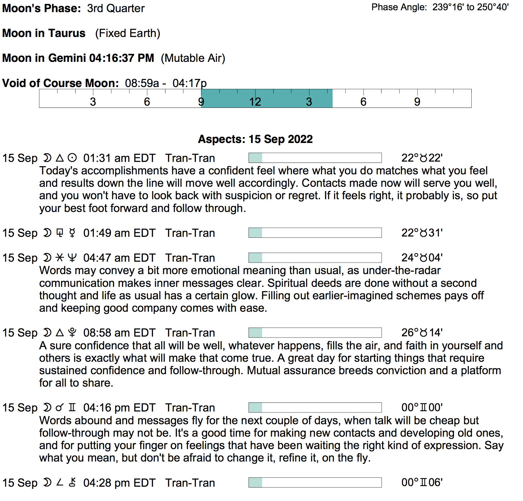 - A void Moon period occurs from 8:58 AM to 4:15 PM today.
