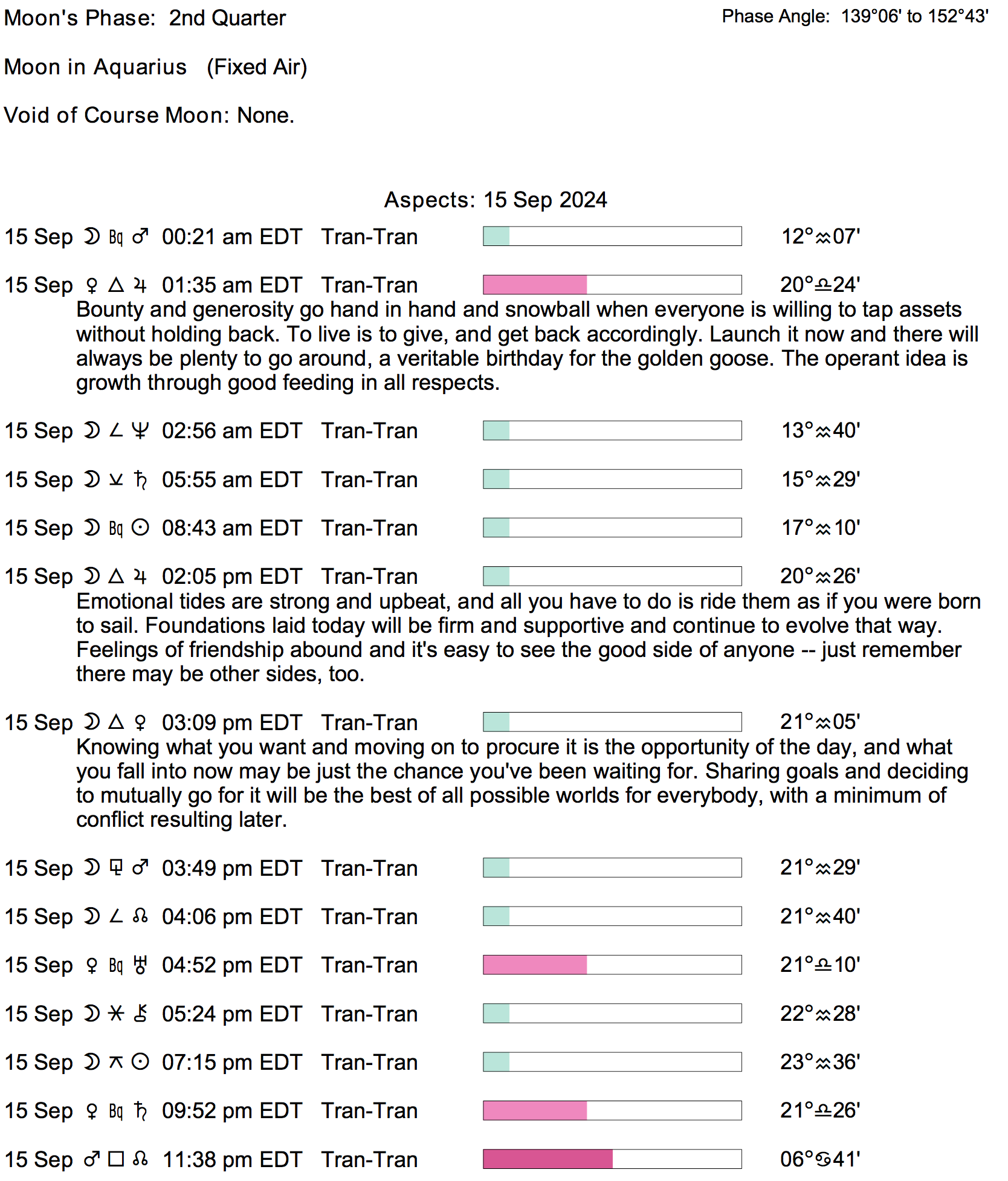 Planet Color Key: The longer the bar, the slower the aspecting planet, and the longer the duration of the planet’s transit.