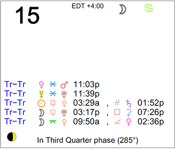 Planet Color Key: The longer the bar, the slower the aspecting planet, and the longer the duration of the planet’s transit.