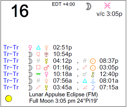 - A Full Moon Lunar Eclipse occurs today at 3:05 PM in the sign of Pisces.
