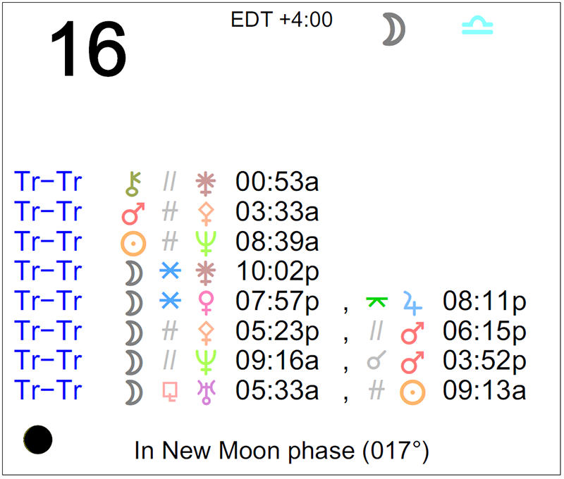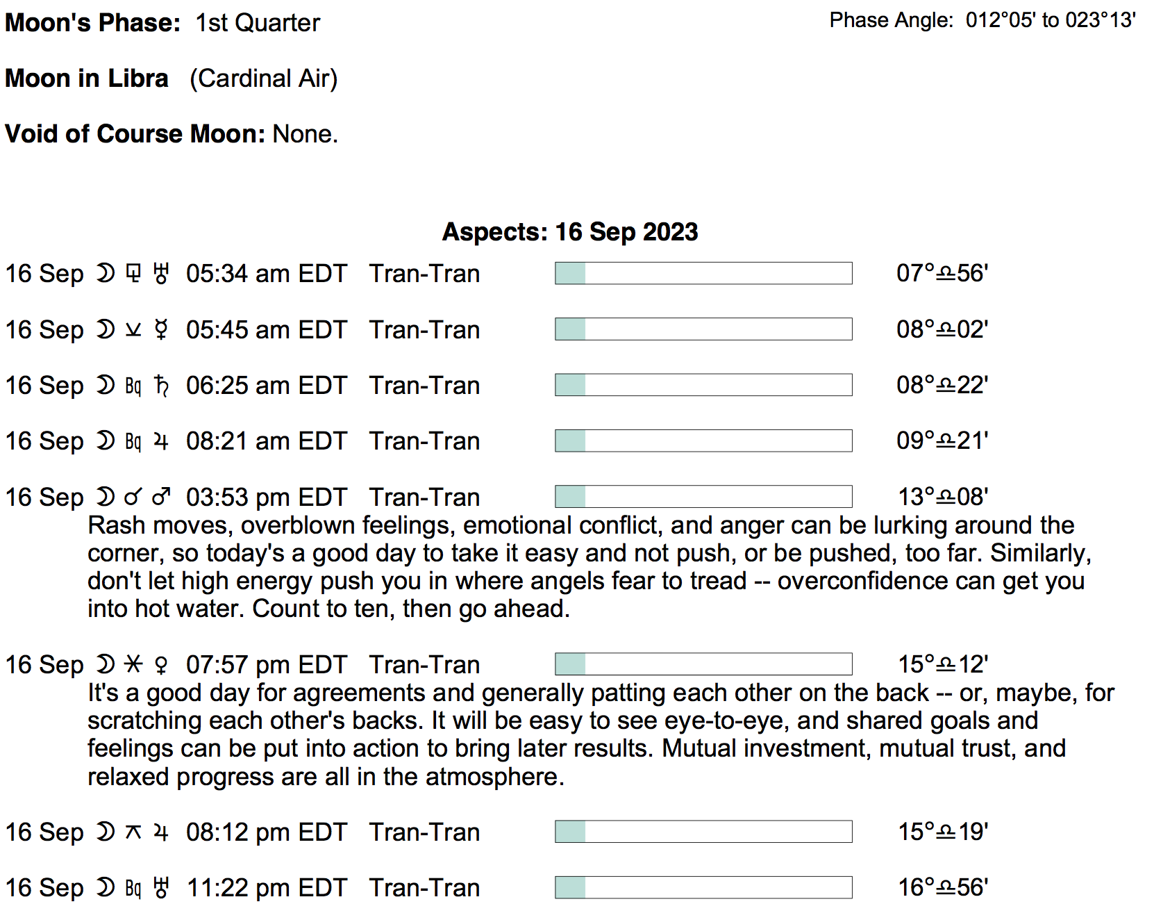 Planet Color Key: The longer the bar, the slower the aspecting planet, and the longer the duration of the planet’s transit.