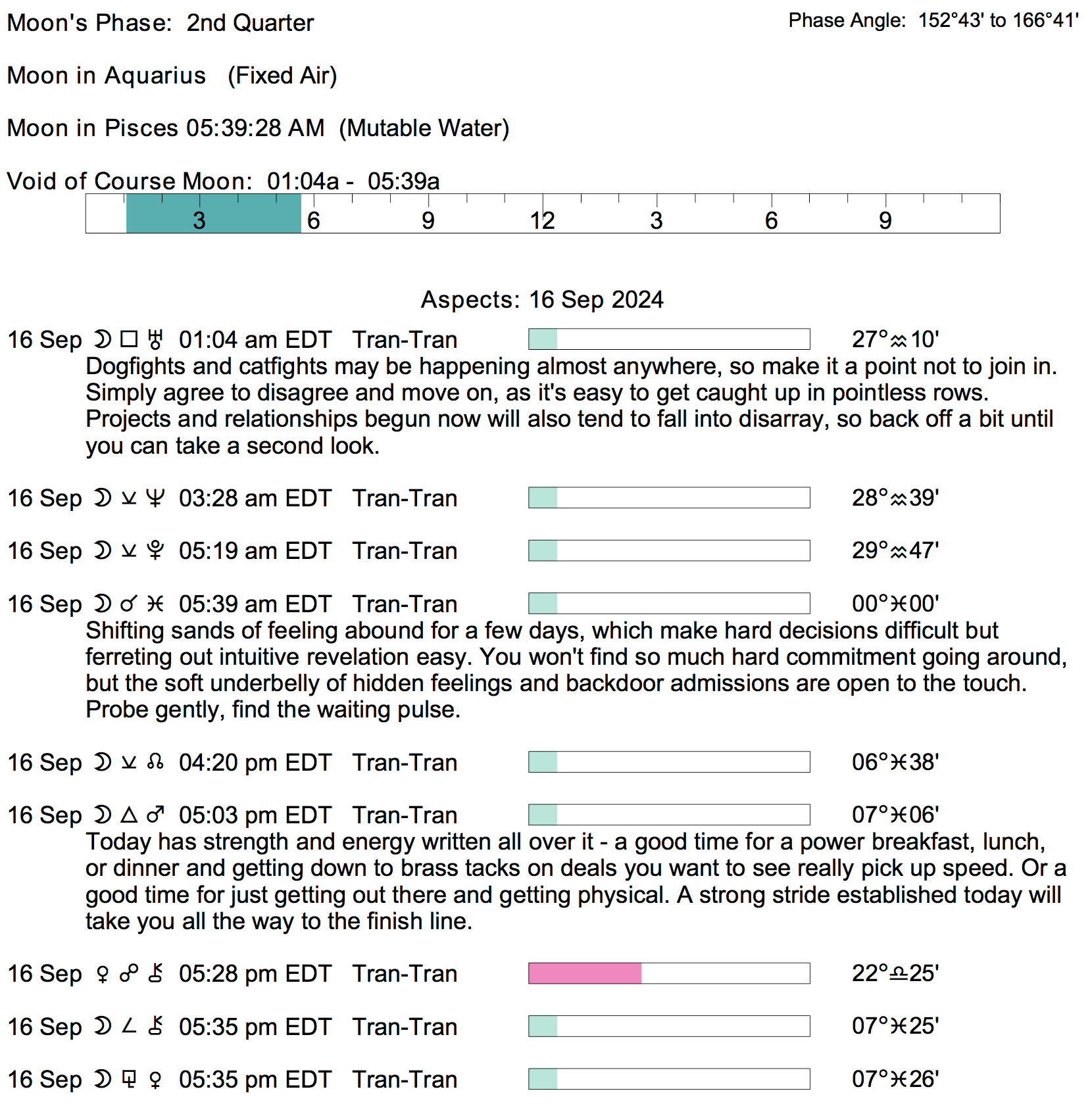- A void Moon period occurs from 1:03 AM to 5:38 AM today.