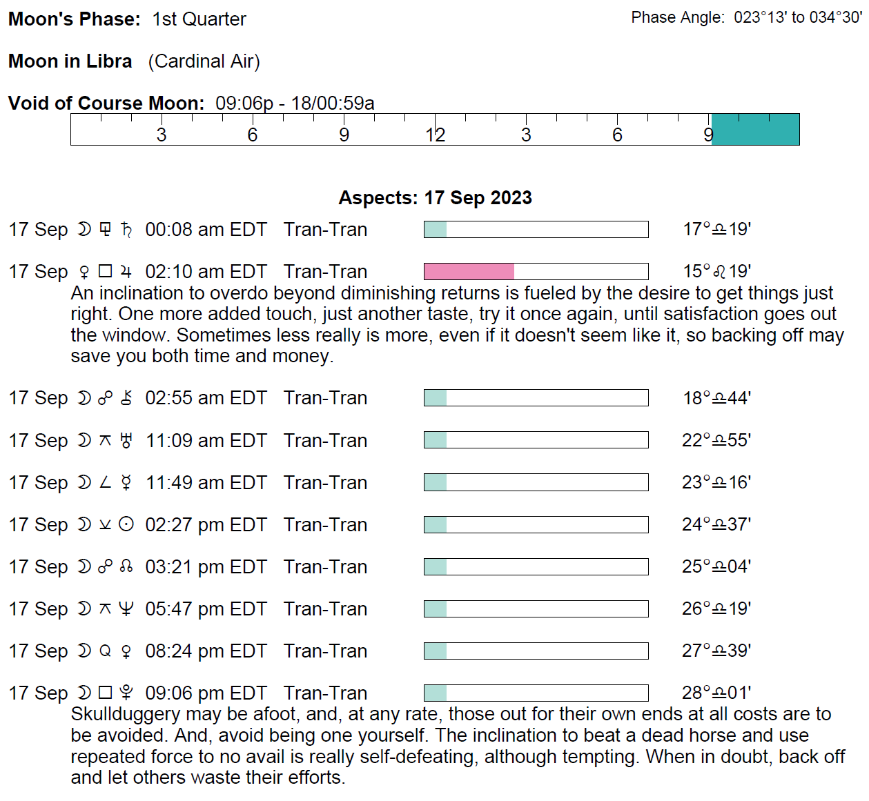 Planet Color Key: The longer the bar, the slower the aspecting planet, and the longer the duration of the planet’s transit.