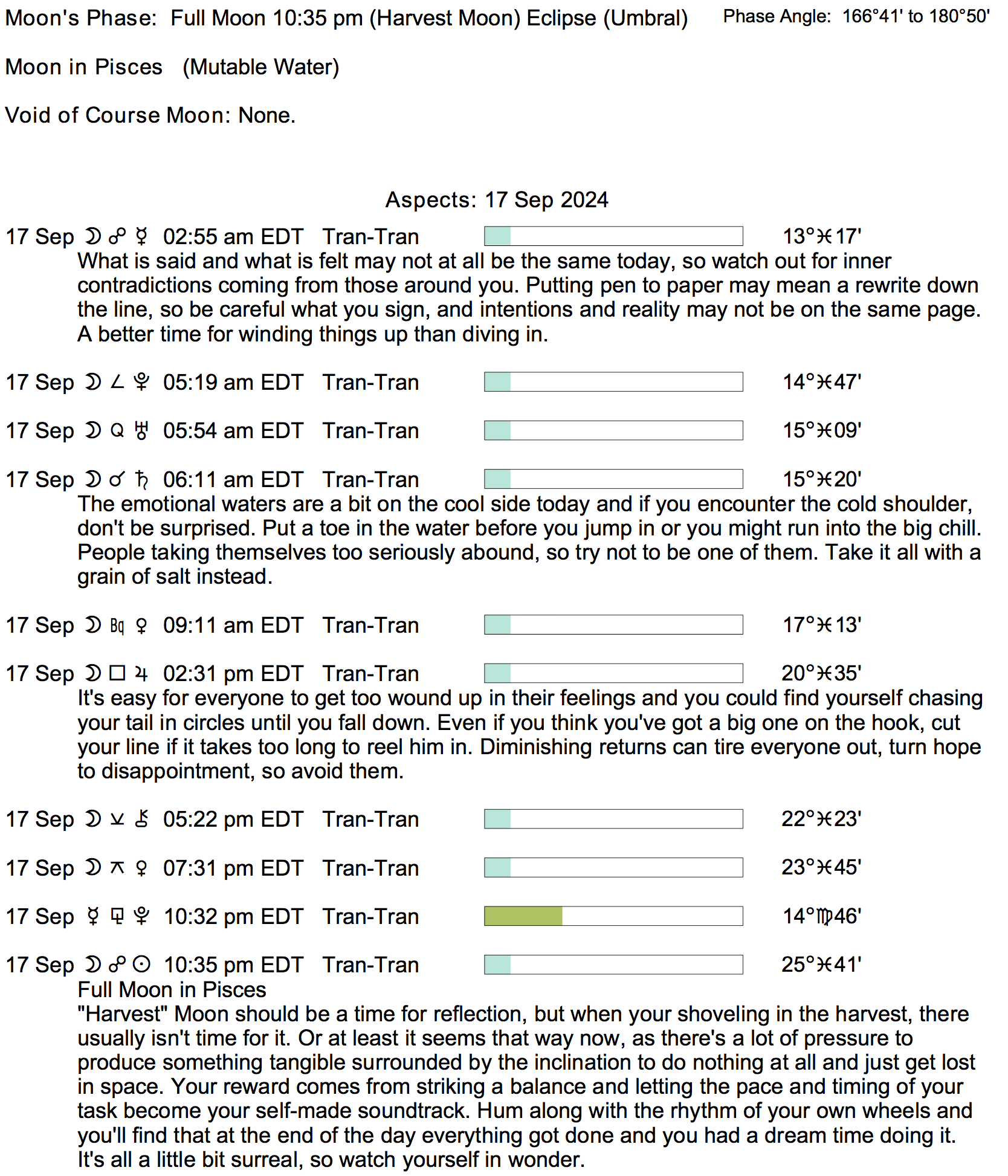 - The Full Moon/Lunar Eclipse occurs tonight at 10:34 PM in the sign of Pisces.