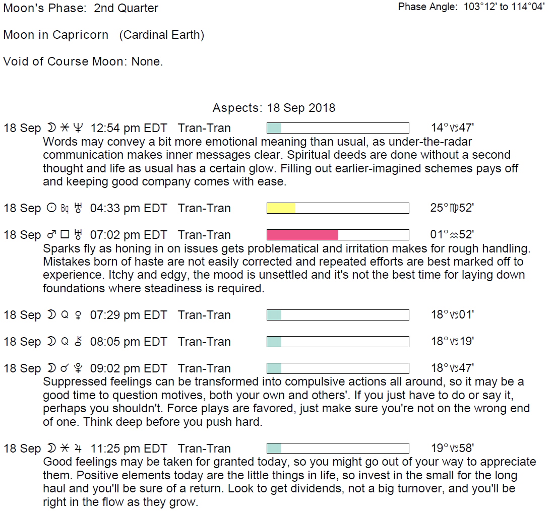 The following aspects (major only) and positions are at noon (EDT) on September 18th:
