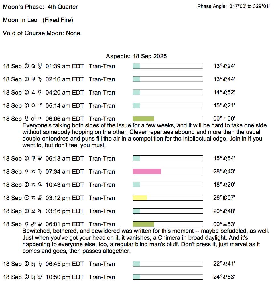 Planet Color Key: The longer the bar, the slower the aspecting planet, and the longer the duration of the planet’s transit.