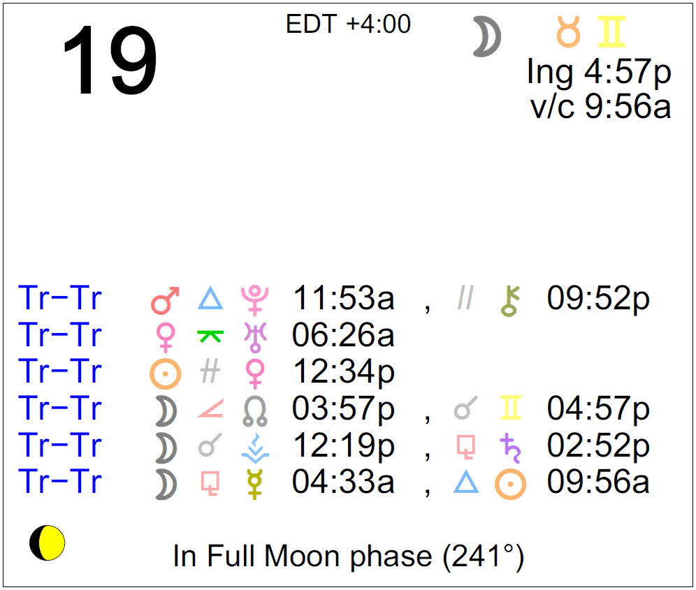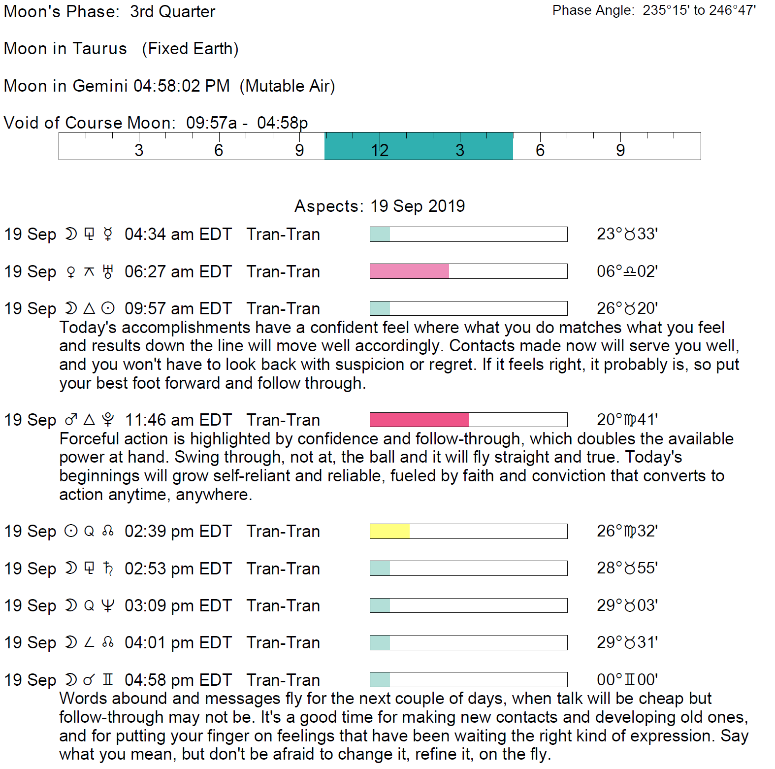 Planet Color Key: The longer the bar, the slower the aspecting planet and the longer the duration of the planet’s transit.