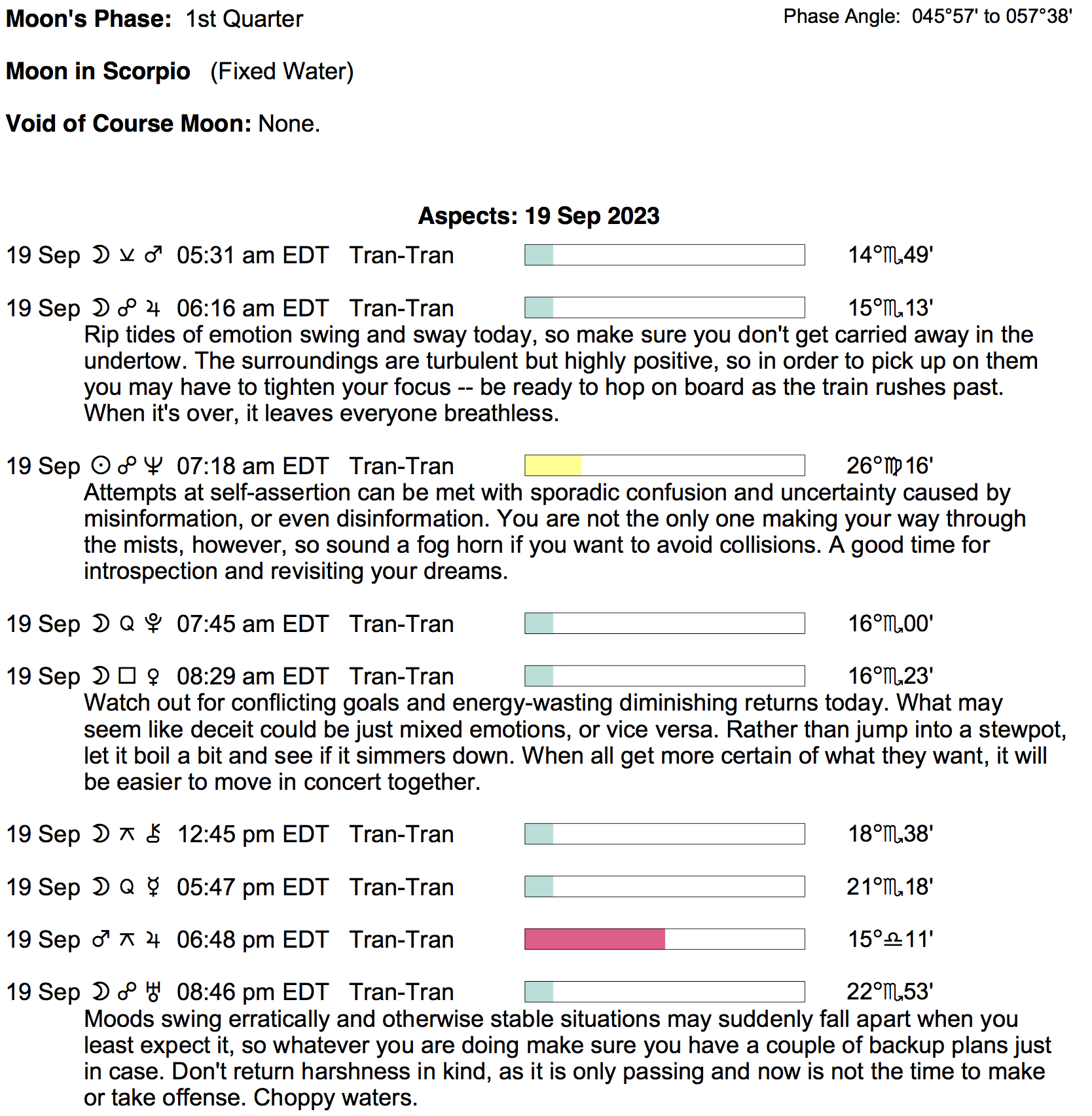 Planet Color Key: The longer the bar, the slower the aspecting planet, and the longer the duration of the planet’s transit.