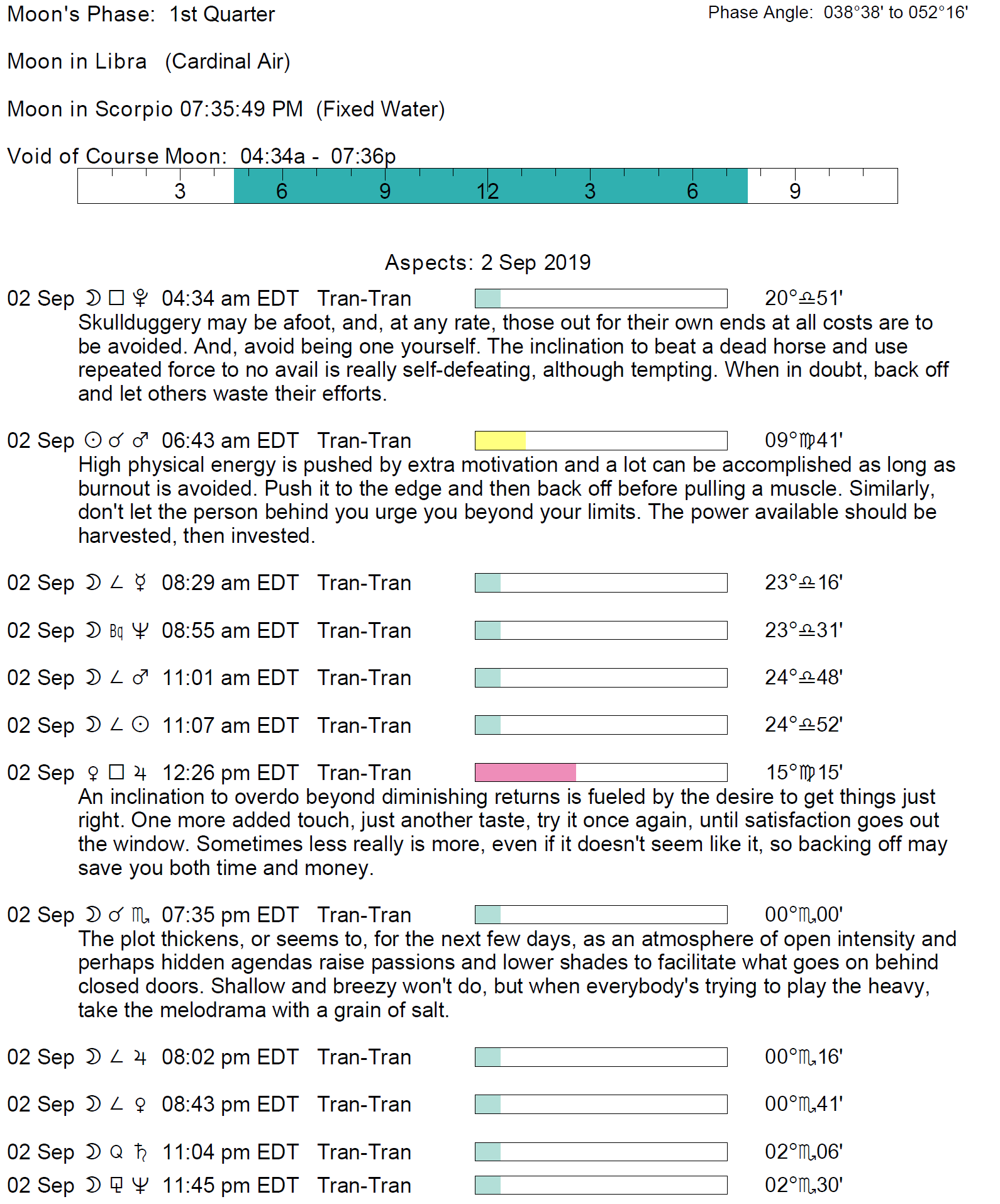 Planet Color Key: The longer the bar, the slower the aspecting planet and the longer the duration of the planet’s transit.
