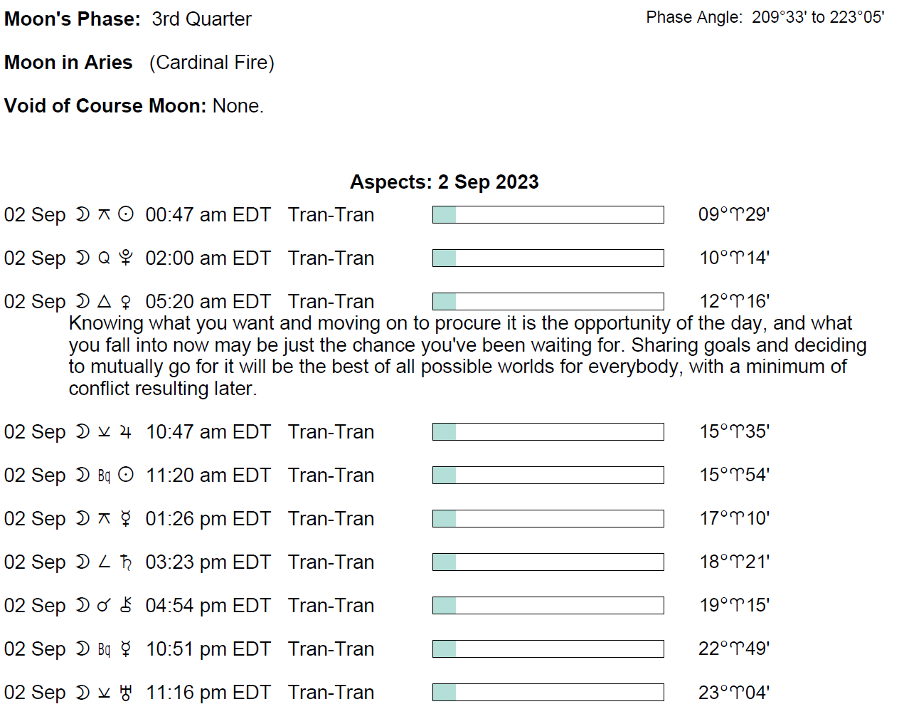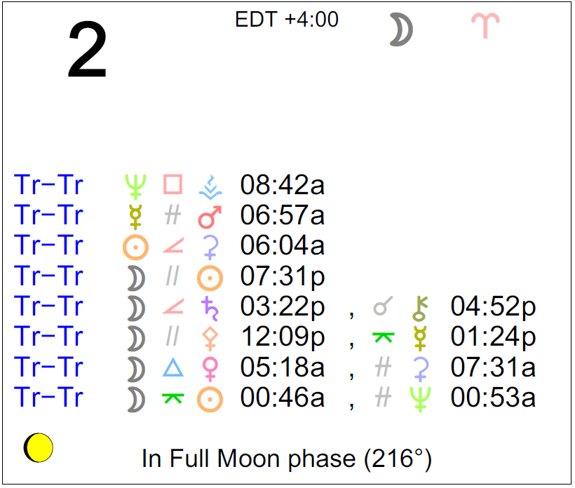 Planet Color Key: The longer the bar, the slower the aspecting planet, and the longer the duration of the planet’s transit.