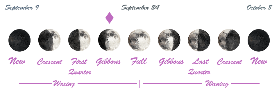 - We are in between the First Quarter Moon (which occurred on the 16th), and the Full Moon (which will occur on September 24th).